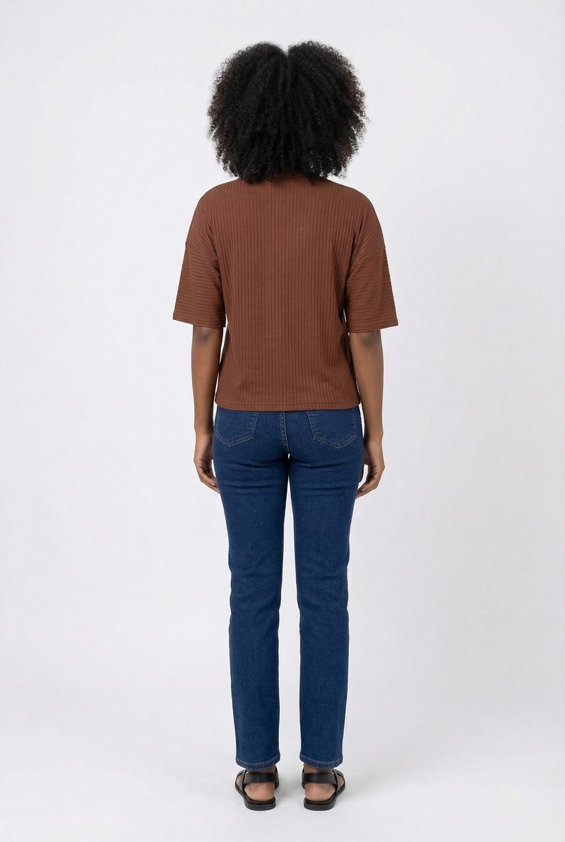 Combine a blusa canelada marrom com jeans de lavagem escura para um visual clássico e despojado. Para um toque mais elegante, use com calças de sarja em tons neutros ou saias midi. Nos pés, sandálias rasteiras, tênis brancos ou botas de cano curto complementam o look com versatilidade.