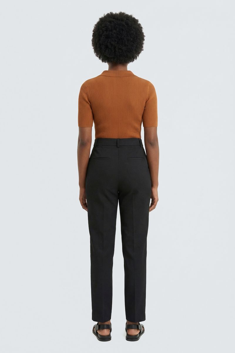 Detalhes: Tricô canelado, gola polo com abertura em V, manga curta