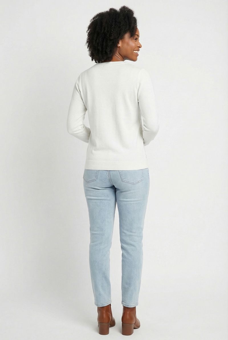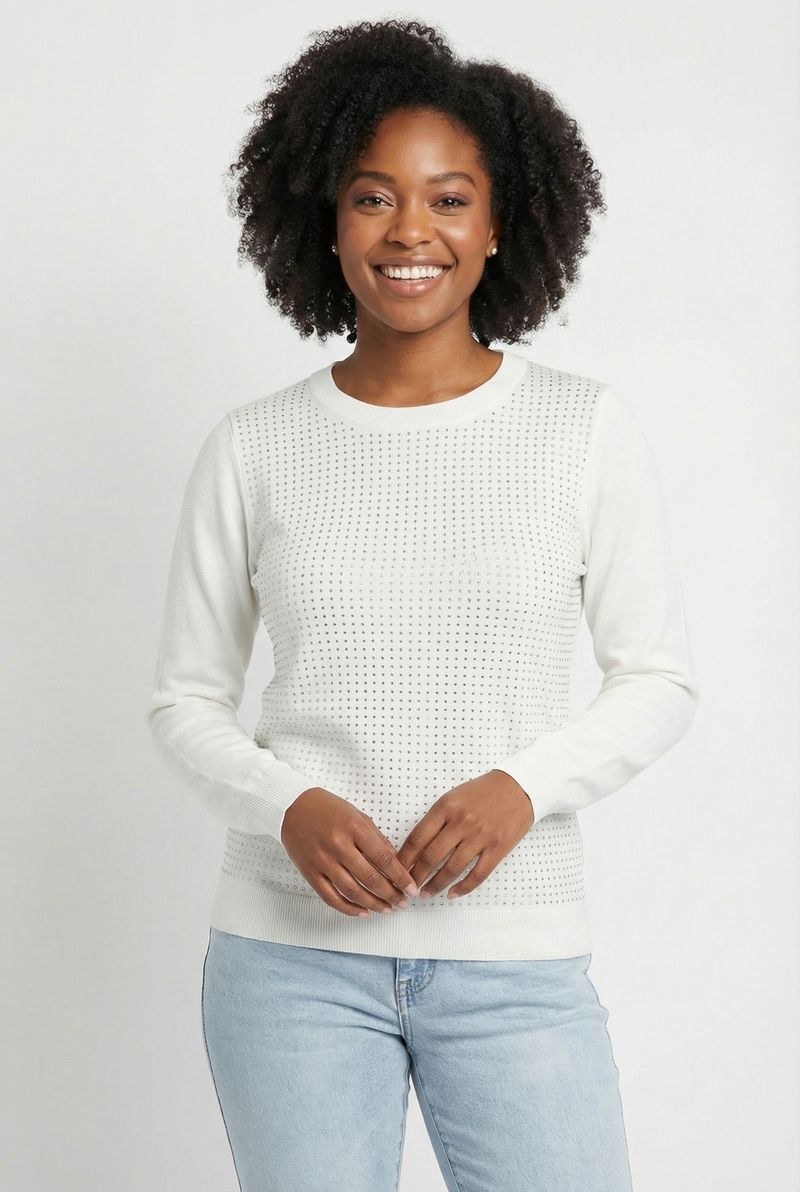 Eleve seu estilo com o Suéter Feminino de Tricô Off White da Caedu. Confeccionado em 100% poliéster, este suéter oferece conforto e um toque de elegância. Seus delicados pontos hotfix adicionam um charme único, tornando-o uma peça essencial para a moda feminina e para criar roupas versáteis.