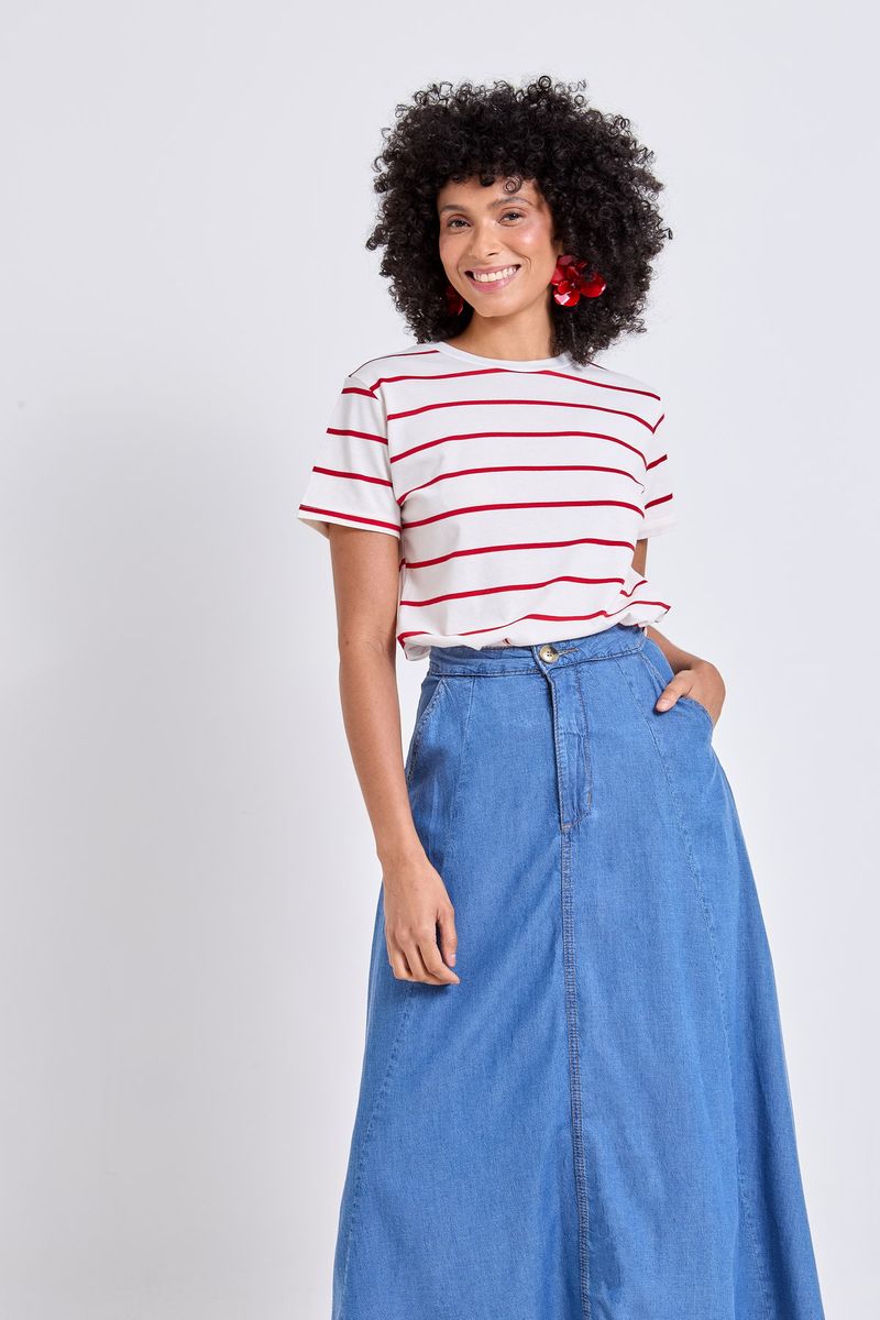 A Blusa Feminina Essencial Listrada Caedu oferece o máximo de conforto com seu tecido em meia malha e caimento solto. Seu design estampado com listras vermelhas e brancas traz um toque de moda e versatilidade para suas roupas do dia a dia.