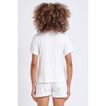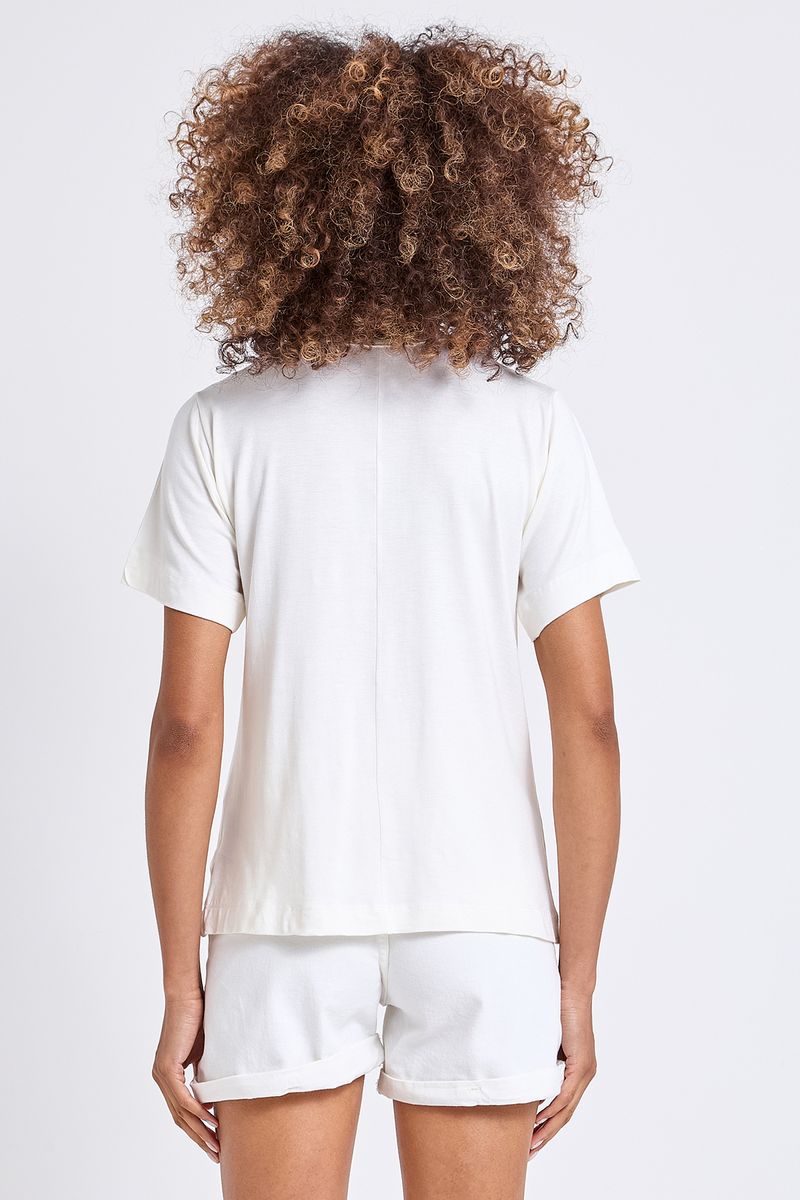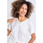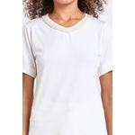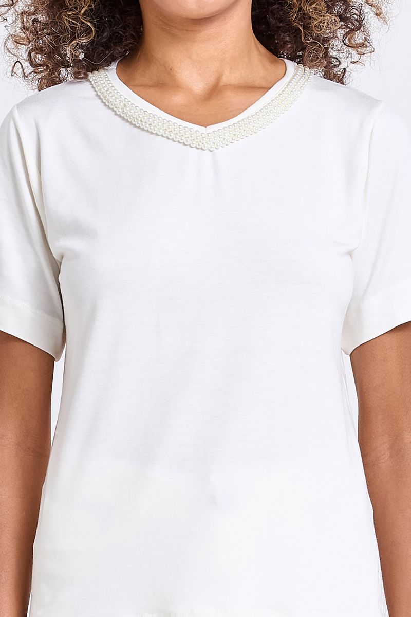Eleve seu estilo com a Blusa Feminina Caedu Off White. Confeccionada em VISCOLYCRA, oferece conforto e caimento perfeito. Sua gola V adornada com pérolas e manga curta garantem um visual chic e versátil para qualquer ocasião, destacando sua elegância.