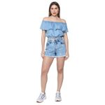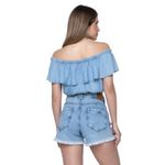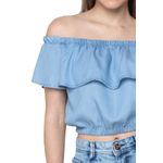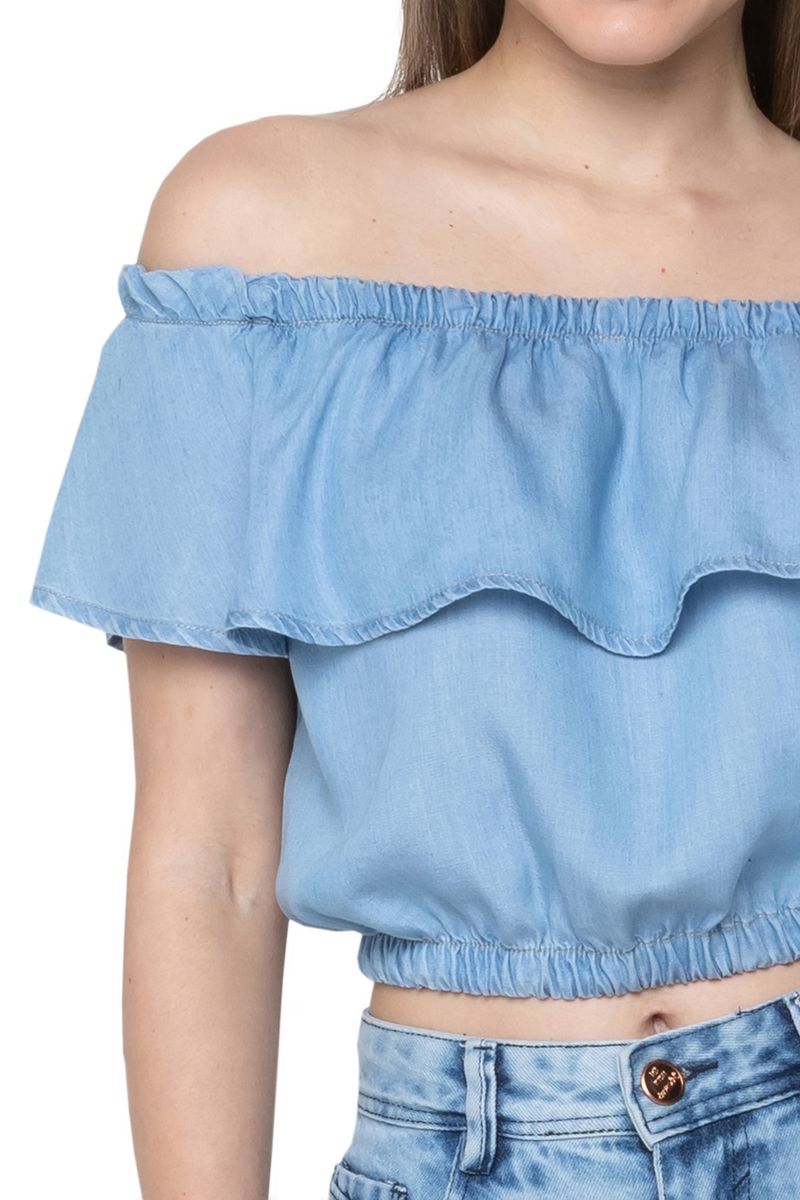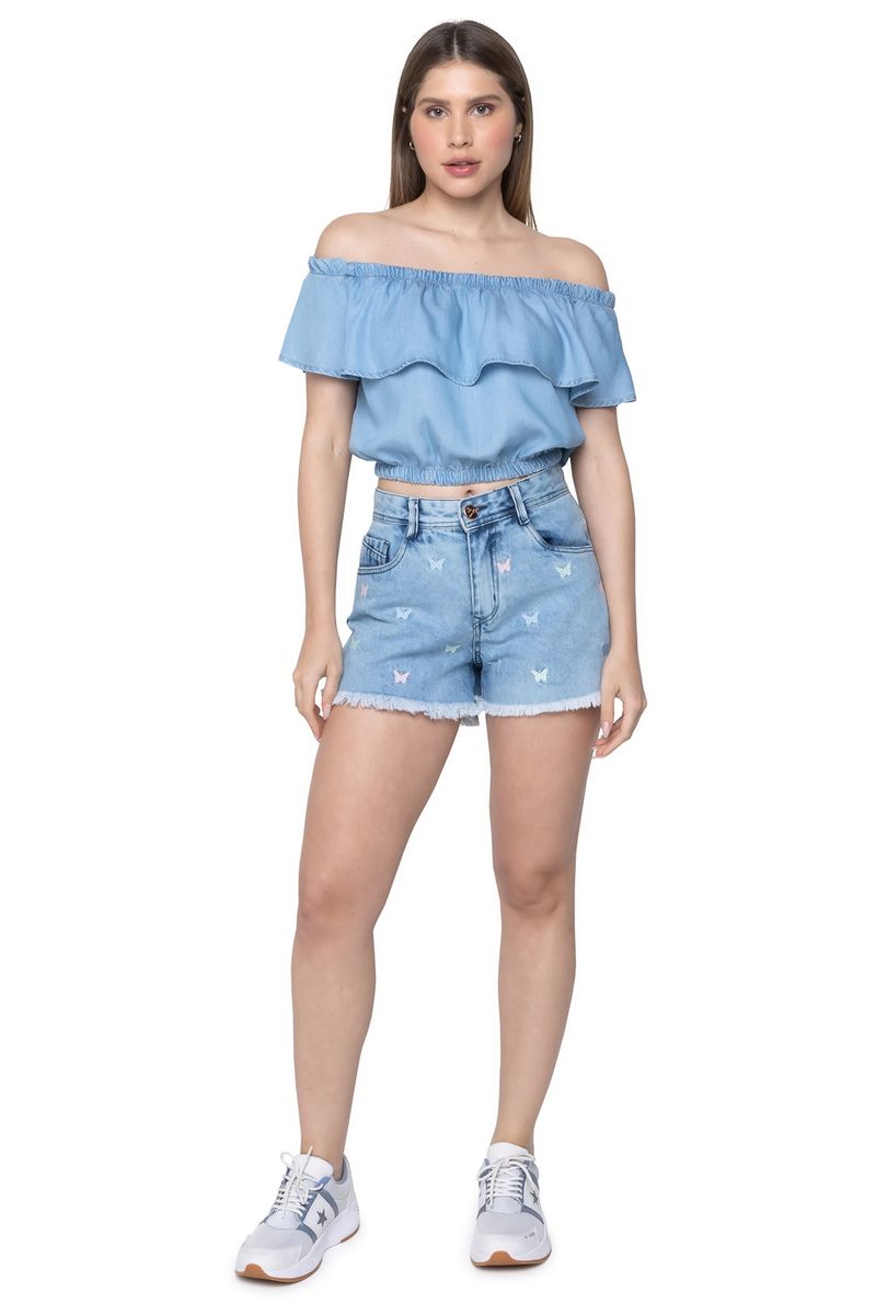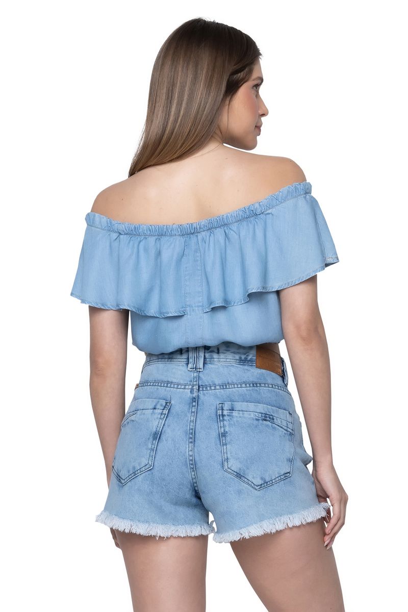 Blusa Cropped Feminina Ciganinha em Jeans Azul Claro
