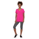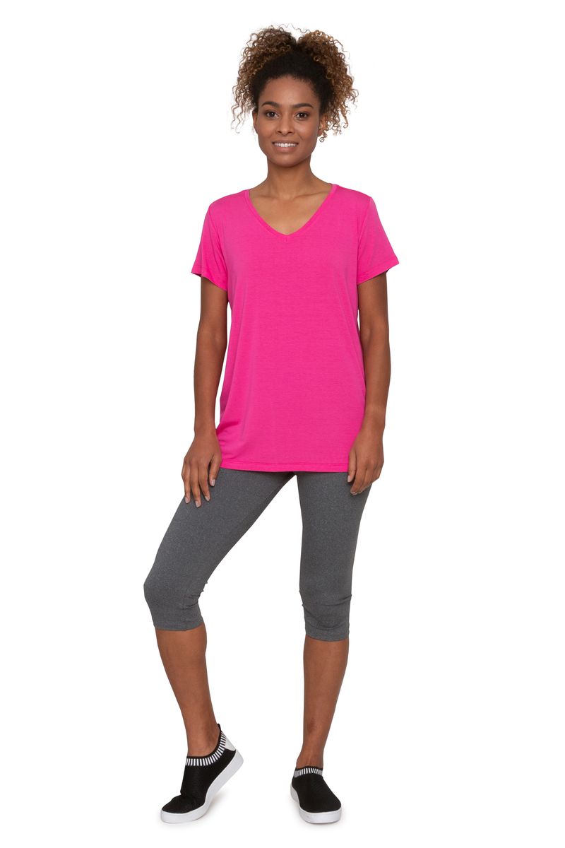 Blusa feminina alongada. Possui decote V e manga curta.