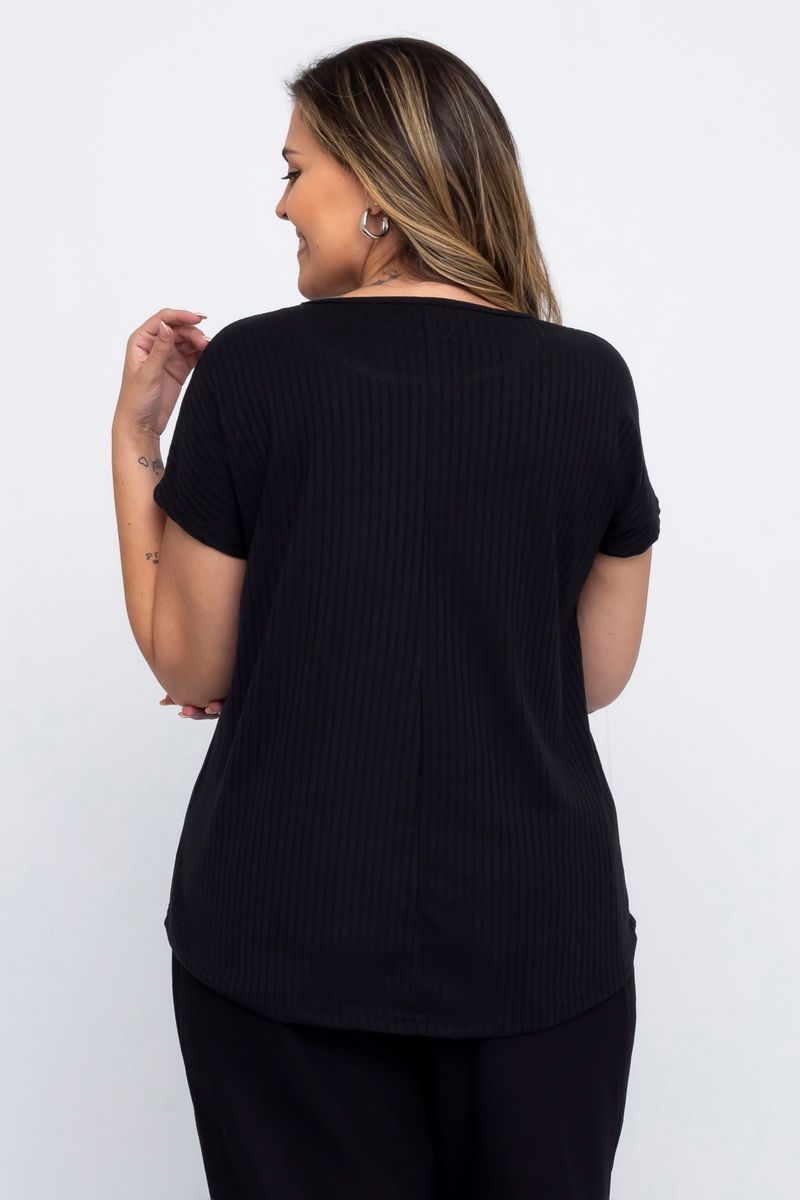 Blusa feminina com modelagem básica, confeccionada em ribana. A peça possui decote redondo e manga curta. Modelo plus size.
