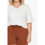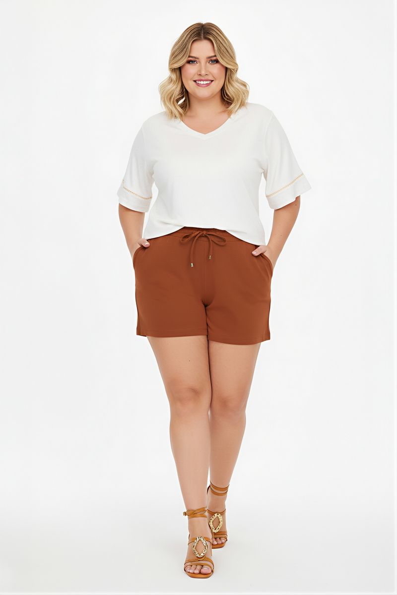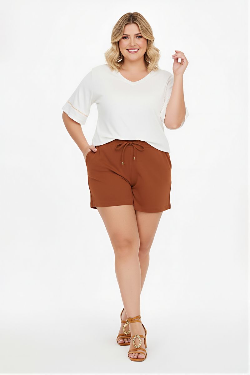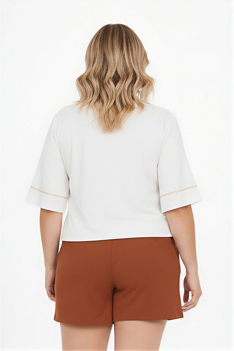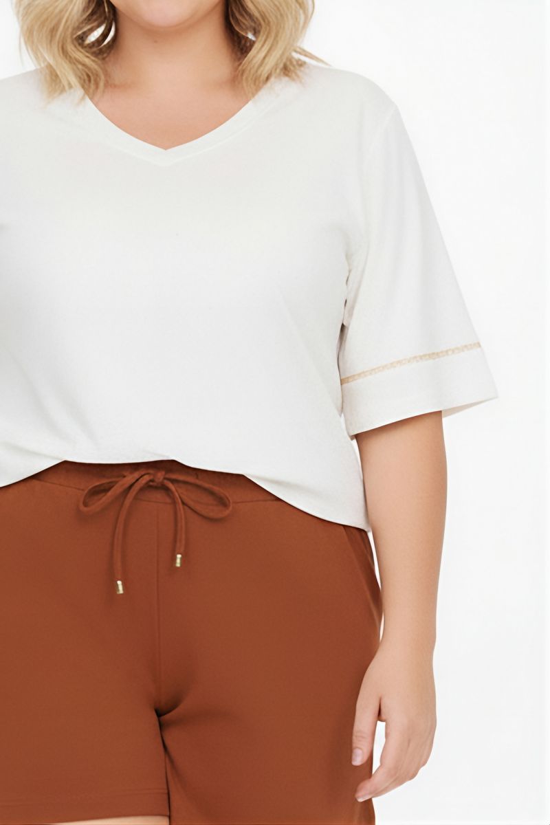 Eleve seu estilo com a Blusa Feminina Off White Decote V da Caedu. Confeccionada em POLIESTER, oferece conforto e caimento perfeito. O decote em V e o sutil detalhe dourado nas mangas curtas adicionam um toque de sofisticação, ideal para a mulher moderna que busca roupas elegantes e versáteis.
