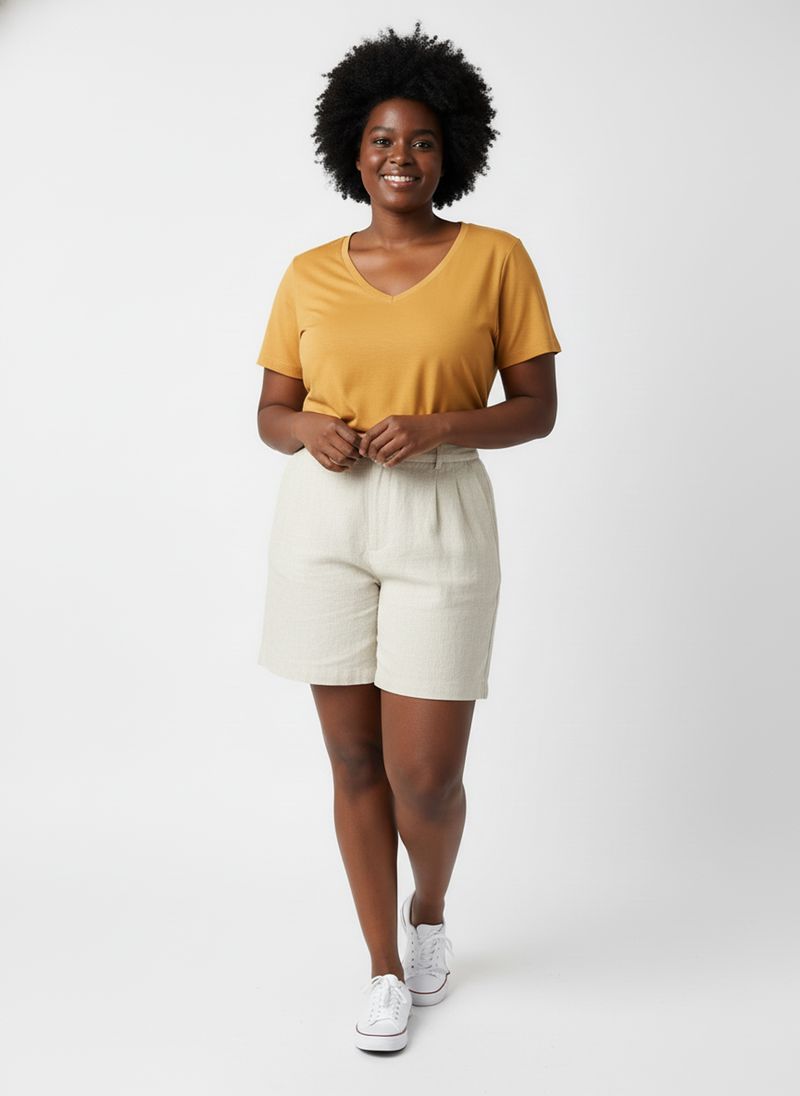 Combine sua blusa amarelo mostarda com um shorts de sarja bege para um visual leve e descontraído, ou com uma calça jeans de cintura alta para um toque urbano. Complete o look com tênis brancos ou sandálias rasteiras e acessórios minimalistas para um estilo casual e autêntico da moda Caedu.