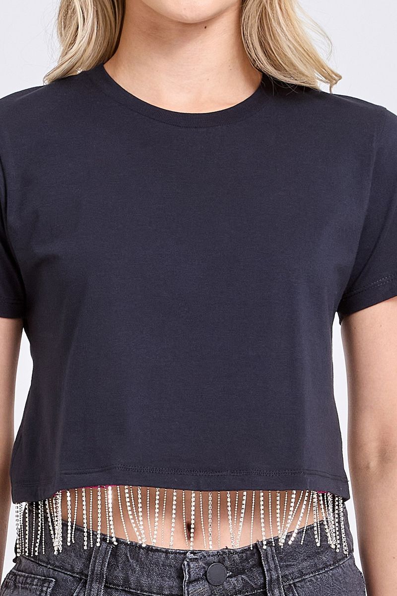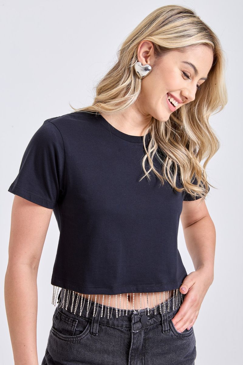 VestuárioFemininoBlusas e CamisetasBlusa fem fsh m/c crop box franja strass preto