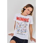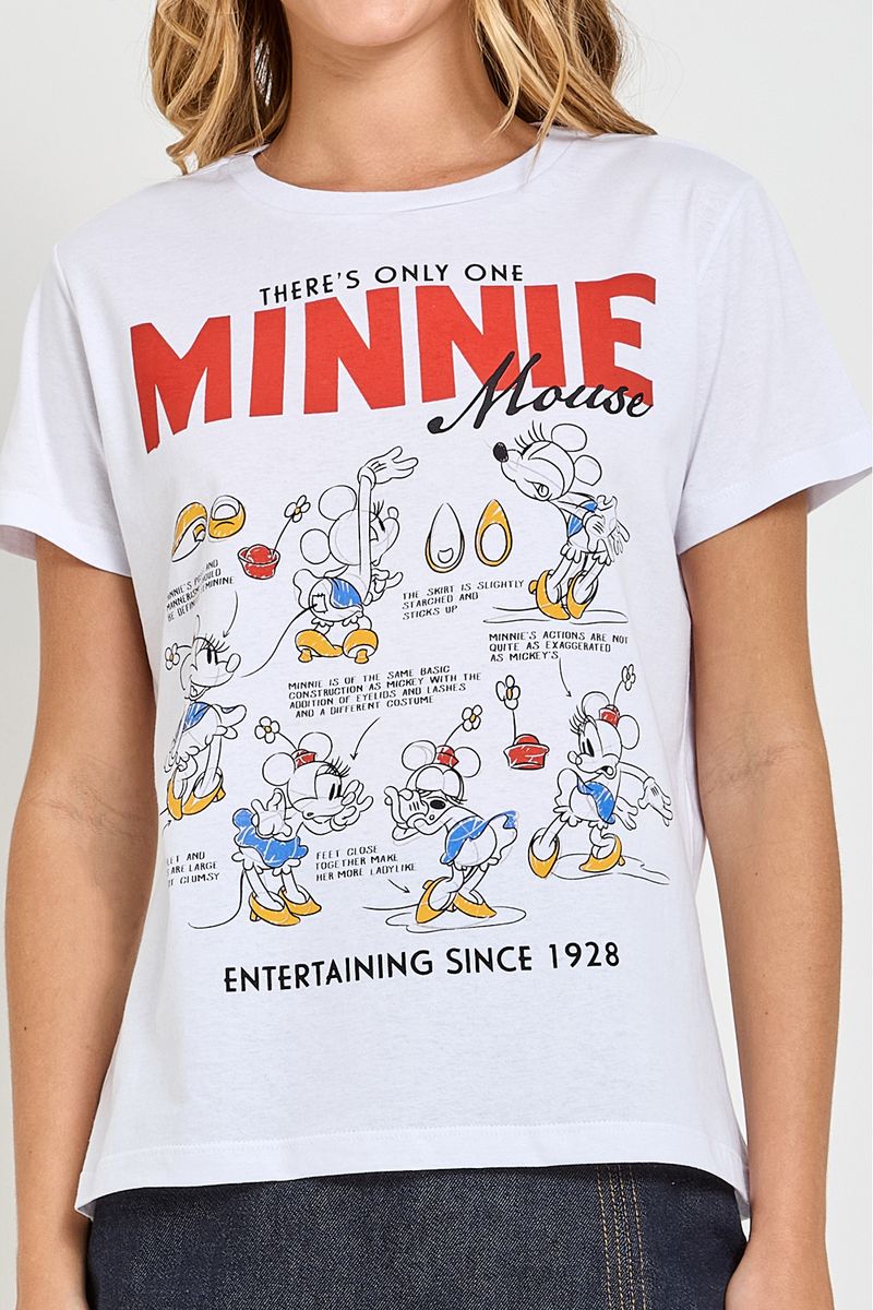 Estampa: Minnie Mouse vintage, com detalhes gráficos e texto "THERE'S ONLY ONE MINNIE Mouse" e "ENTERTAINING SINCE 1928"