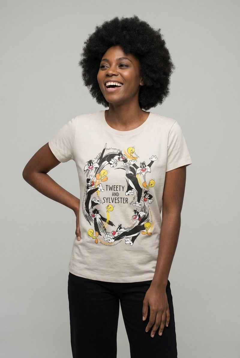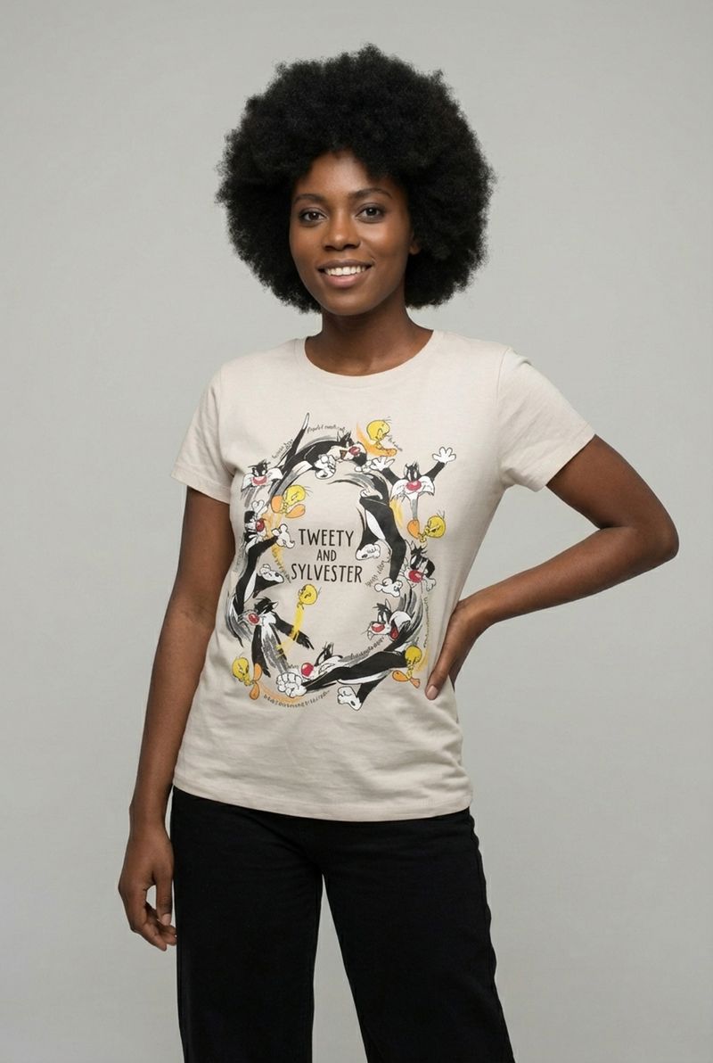 Celebre a diversão com a Blusa Feminina Caedu Piu-Piu e Frajola. Confeccionada em 100% algodão de meia malha, esta roupa oferece conforto e um toque suave. Sua estampa clássica e vibrante dos Looney Tunes em bege claro adiciona um charme único ao seu estilo, perfeita para quem busca moda e alegria.