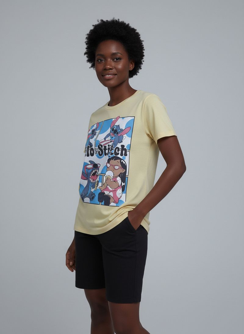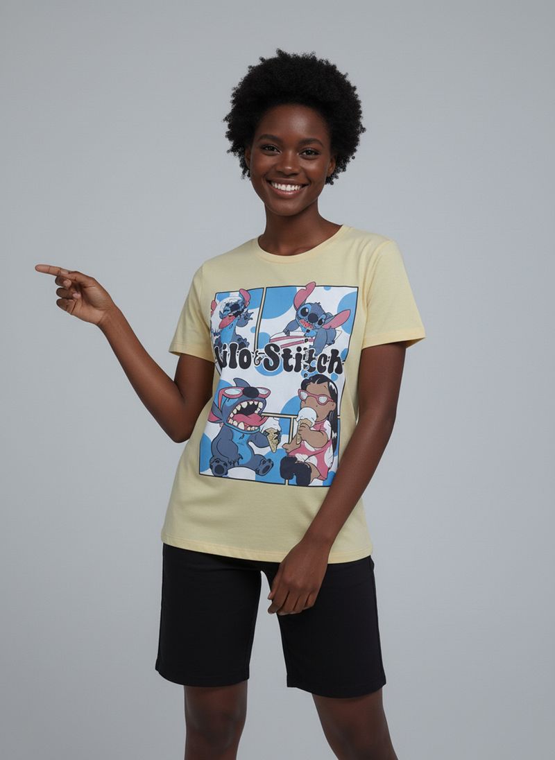 A Blusa Feminina Lilo & Stitch Estampada Sorvete Amarelo Claro da Caedu é pura inspiração. Em 100% algodão e meia malha, oferece conforto e toque suave. A estampa divertida de Lilo e Stitch com sorvetes adiciona um toque único e alegre ao seu visual.
