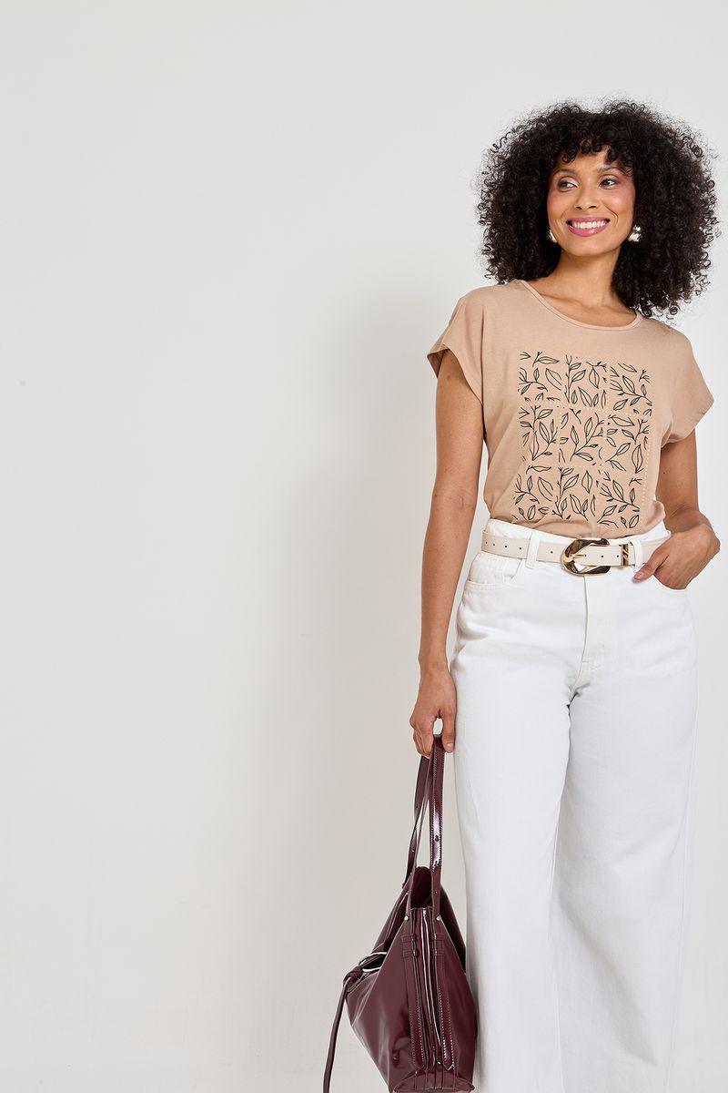 Desfrute do conforto natural e do estilo casual com a Blusa Feminina Caedu. Confeccionada em viscolycra, esta peça bege com estampa de folhas e gola redonda oferece um caimento relaxed, ideal para a moda do dia a dia. Uma roupa versátil que realça sua beleza.