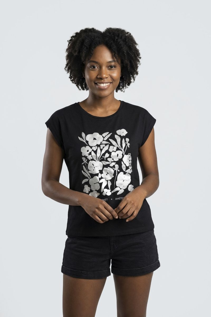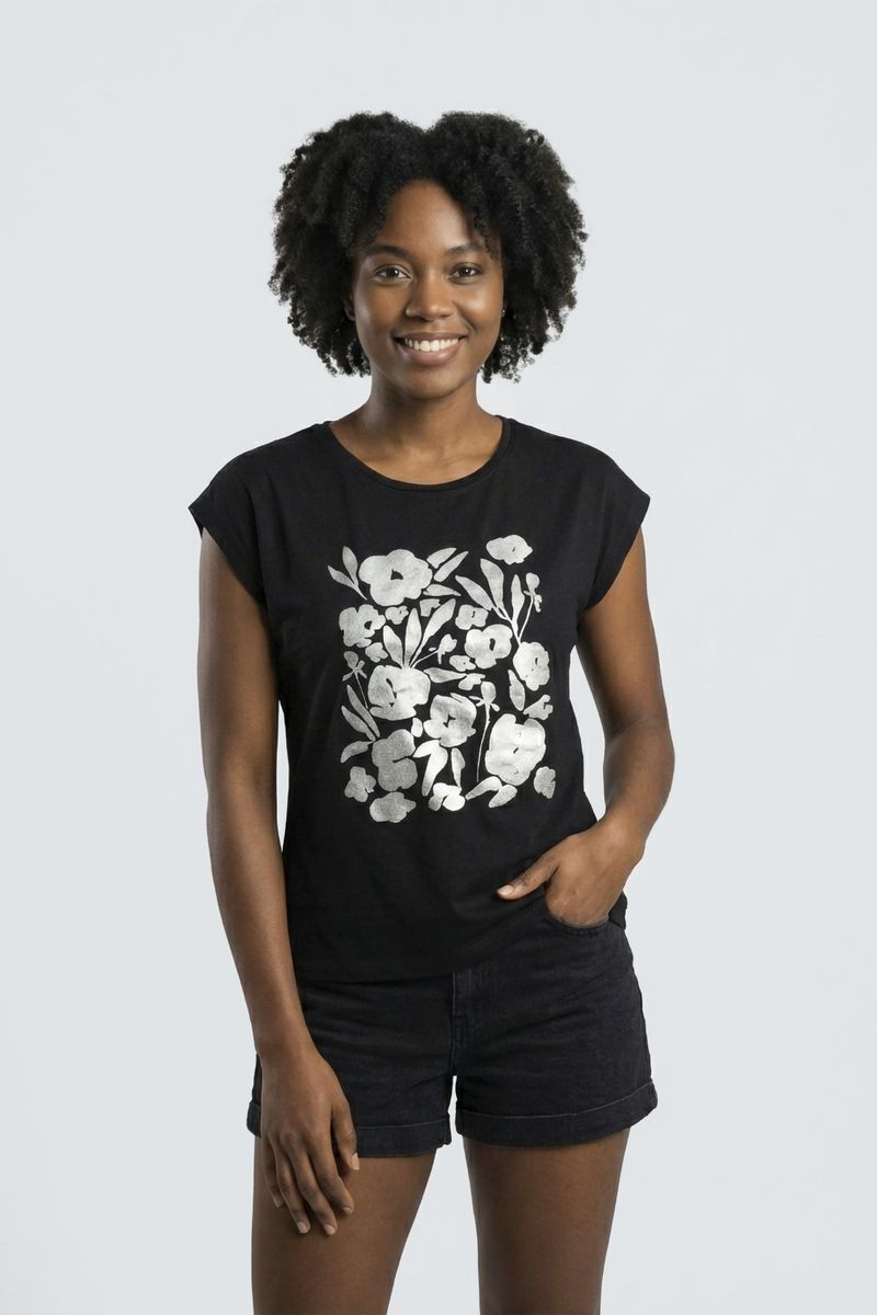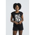 A Blusa Feminina Caedu em VISCOLYCRA preta com estampa floral prateada oferece conforto e estilo. Com decote arredondado e mangas curtas, esta roupa é ideal para um visual moderno e sofisticado.