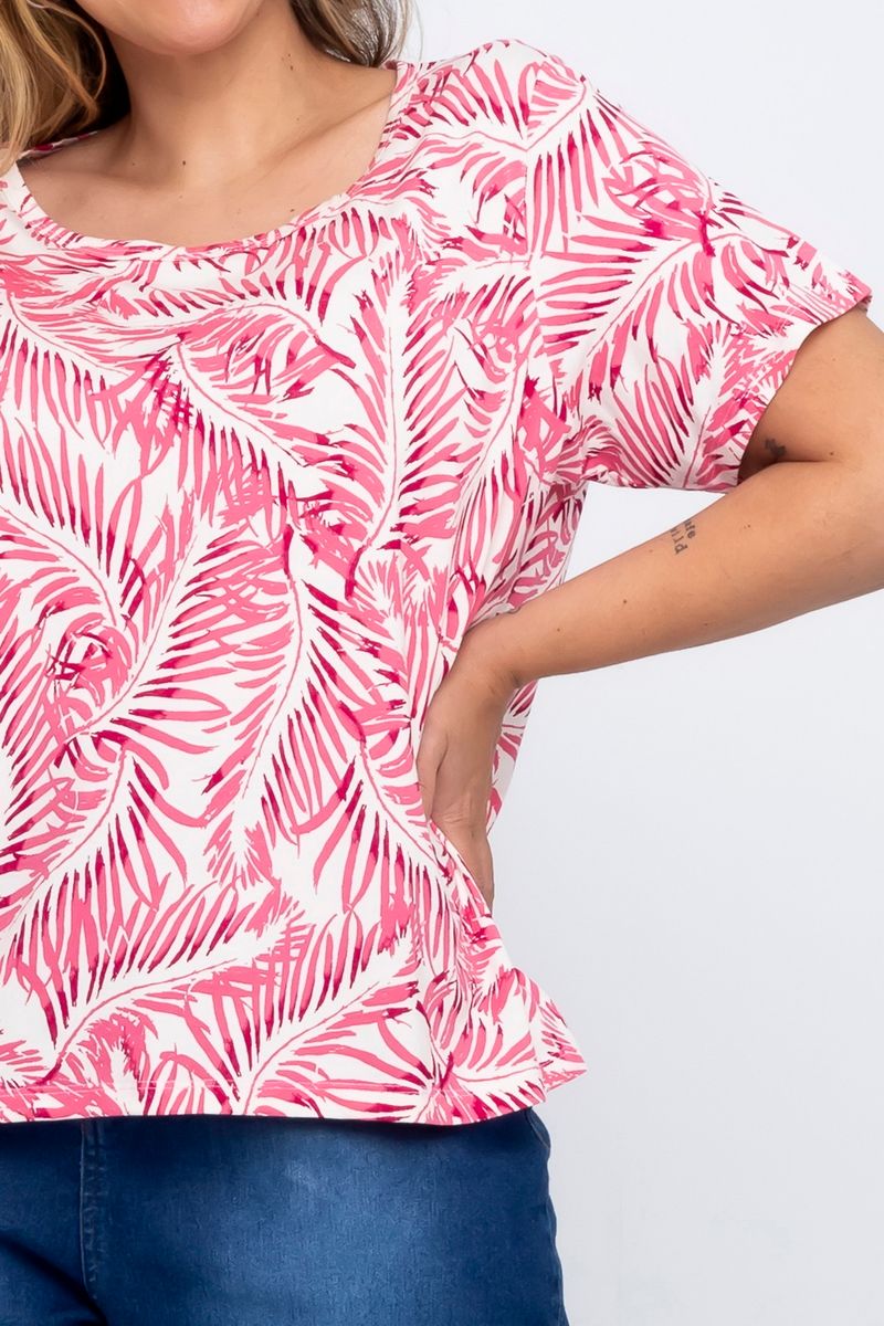 VestuárioFemininoNovidadesBlusas e CamisetasBlusa Casual Feminina em Viscolycra com Estampa Folhas Feita Pra Mim Branca e Rosa