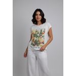 A Blusa Feminina Caedu Off-White 'Frutti di Sicilia' Estampada é a escolha perfeita para quem busca moda e conforto. Confeccionada em VISCOLYCRA, possui mangas curtas 'cap sleeve' e gola redonda, destacando-se pela estampa vibrante de folhagens e frutos. Uma roupa ideal para um visual fresco e casual.