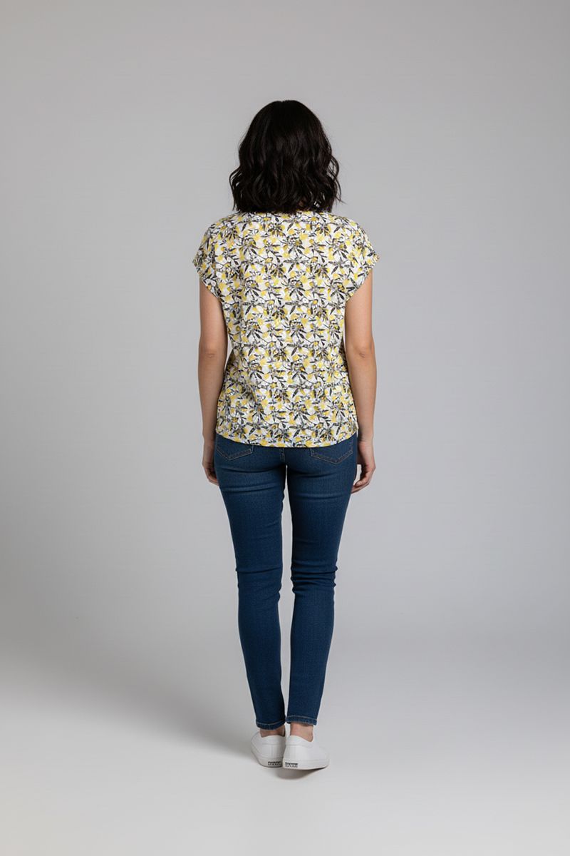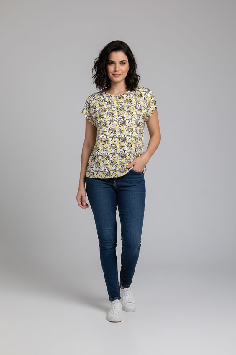 Blusa Feminina Manga Curta Estampada Folhagem Amarela e Cinza Caedu