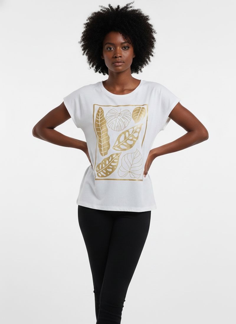 A blusa feminina Off White Caedu é a escolha perfeita para quem busca estilo e conforto. Com estampa dourada de folhagem tropical, decote redondo e caimento solto, esta peça versátil eleva qualquer look. Ideal para a moda feminina atual.