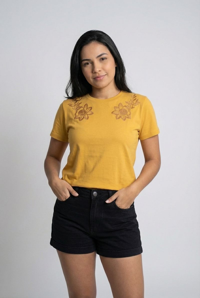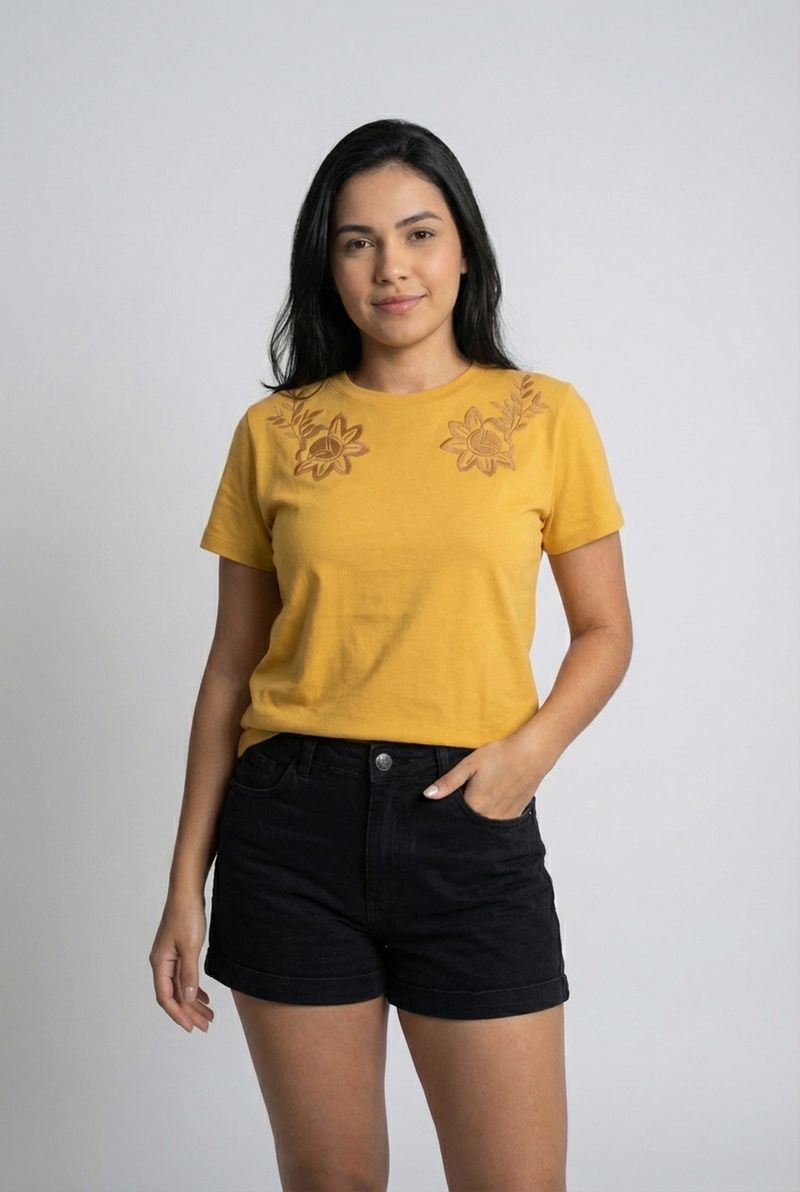 Desperte seu estilo com a Blusa Feminina Amarela Mostarda Caedu. Confeccionada em meia malha, oferece conforto e leveza. O bordado floral nos ombros adiciona um toque de sofisticação e exclusividade, ideal para quem busca roupas que unem beleza e bem-estar. Uma peça versátil para a moda atual.
