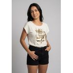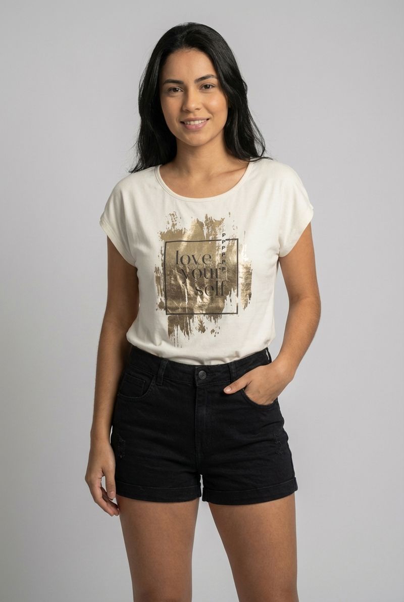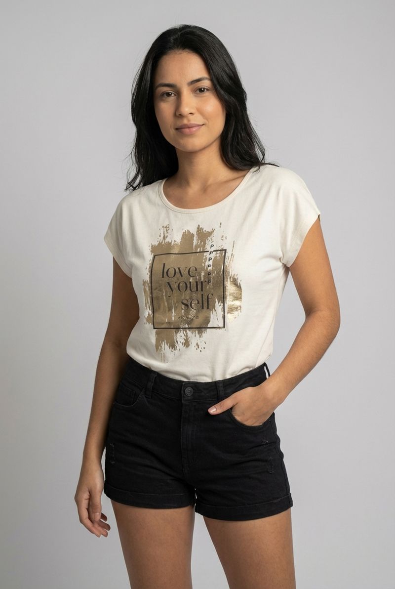 Sinta-se inspirada e confortável com a Blusa Feminina Off-White Love Yourself Caedu. Confeccionada em VISCOLYCRA, possui decote redondo, mangas curtas e uma estampa dourada com a frase "love yourself", perfeita para expressar sua personalidade com moda e estilo.