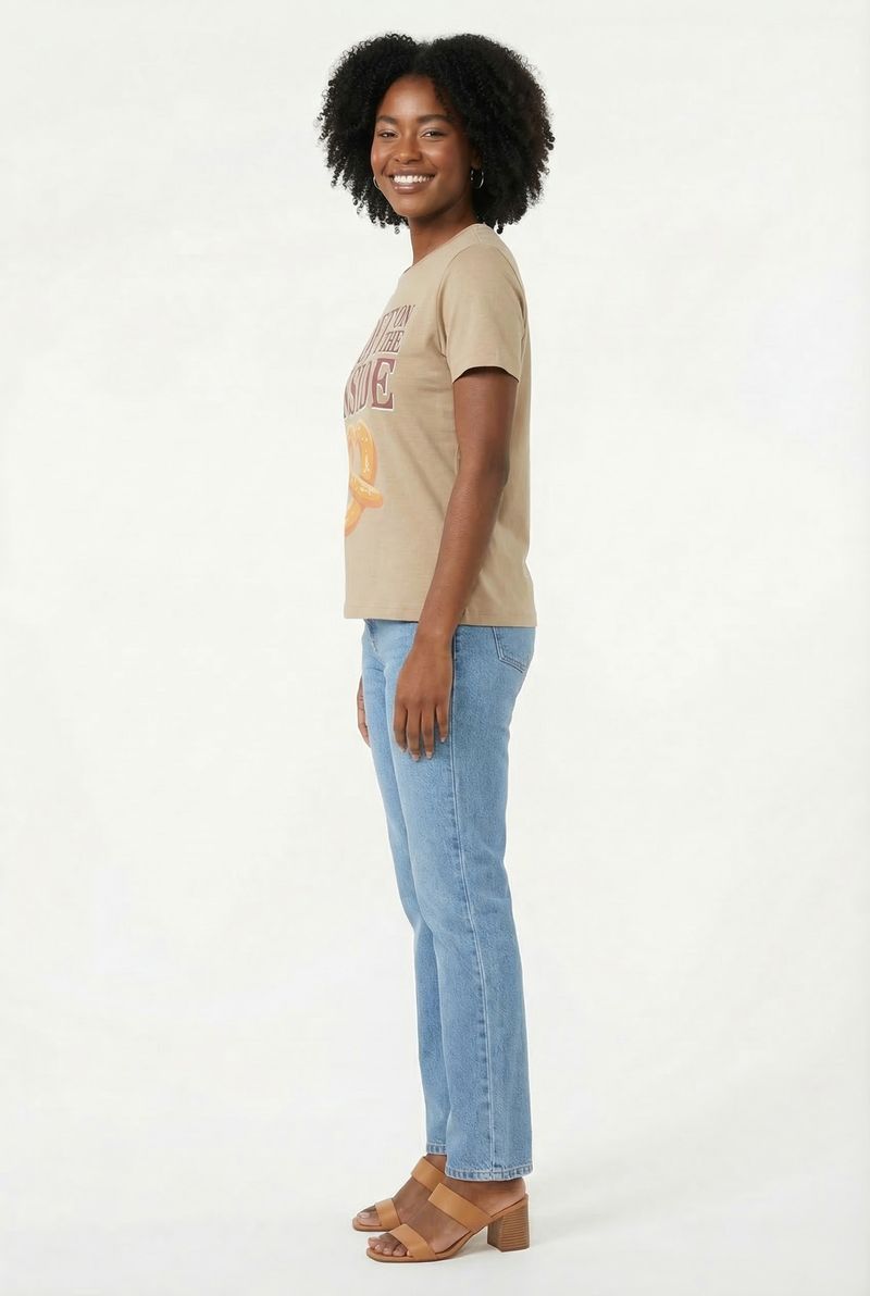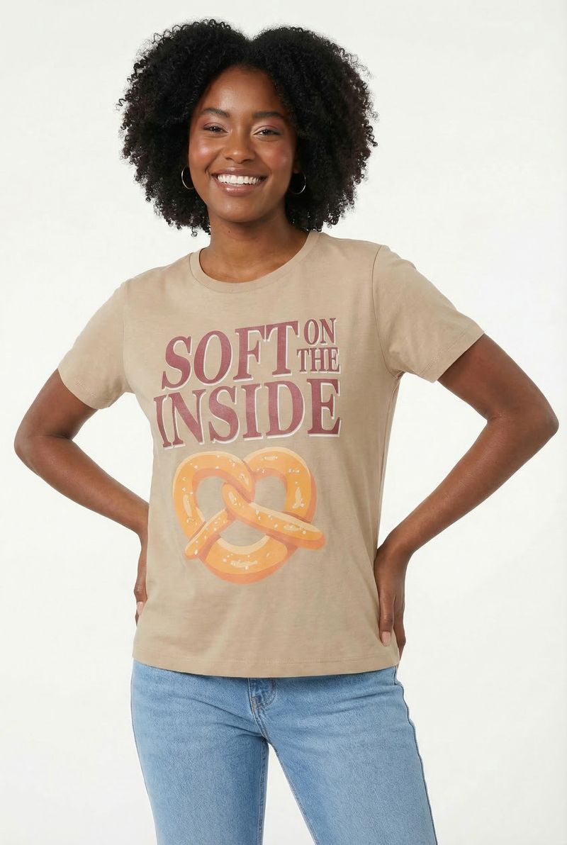 Eleve seu estilo com a Camiseta Feminina Estampada Pretzel 'Soft On The Inside' Bege Caedu. Confeccionada em 100% algodão de meia malha, esta peça oferece conforto e toque suave. Sua cor bege, um elegante tom terroso, alinha-se às últimas tendências da moda, garantindo um visual moderno e versátil. A estampa exclusiva 'Soft On The Inside' com um pretzel adiciona um charme único e despojado ao seu guarda-roupa.