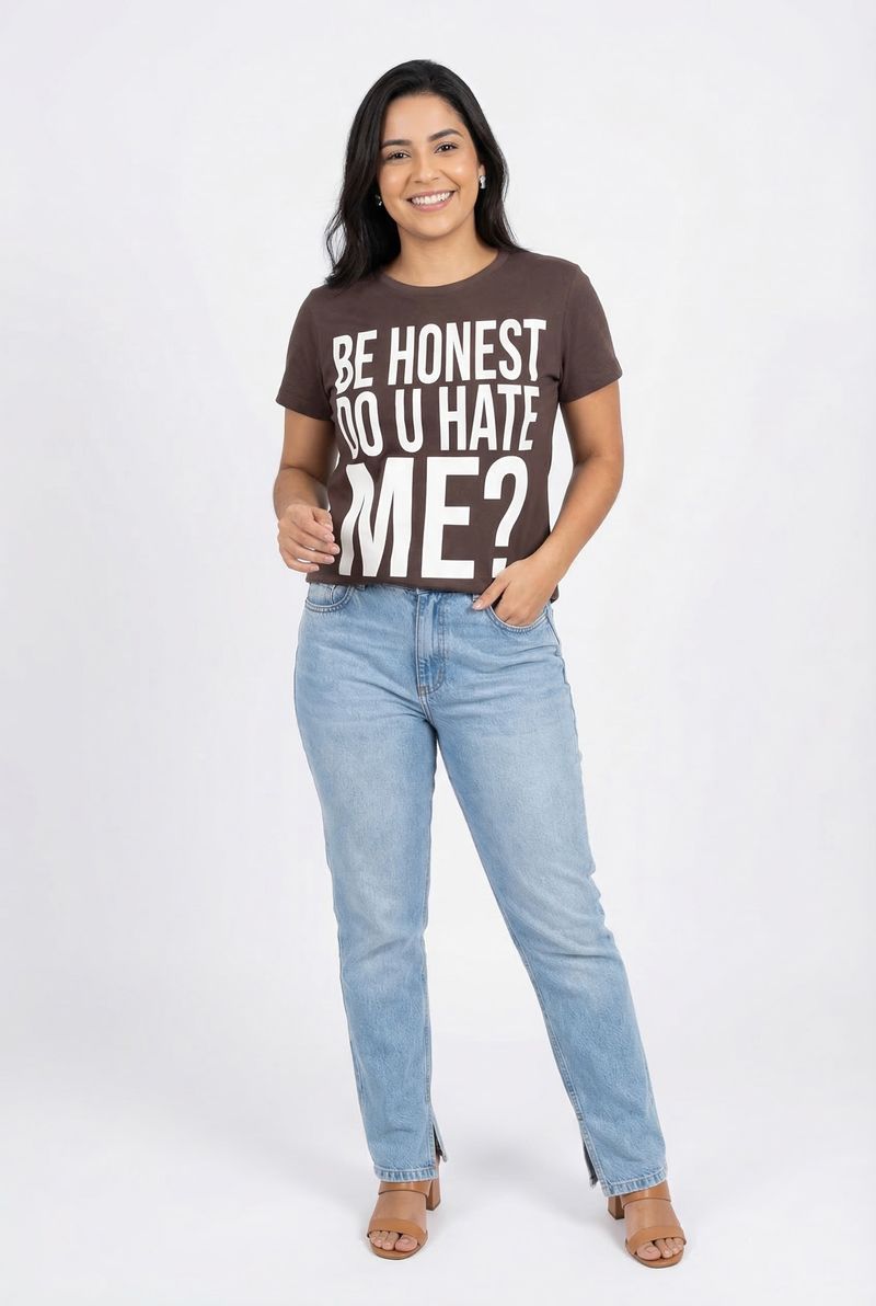 A Blusa Feminina Cropped Marrom Caedu, em 100% algodão de meia malha, é a peça-chave para um visual moderno. Com a tendência dos tons terrosos e estampa divertida, oferece conforto e estilo autêntico, elevando sua moda.