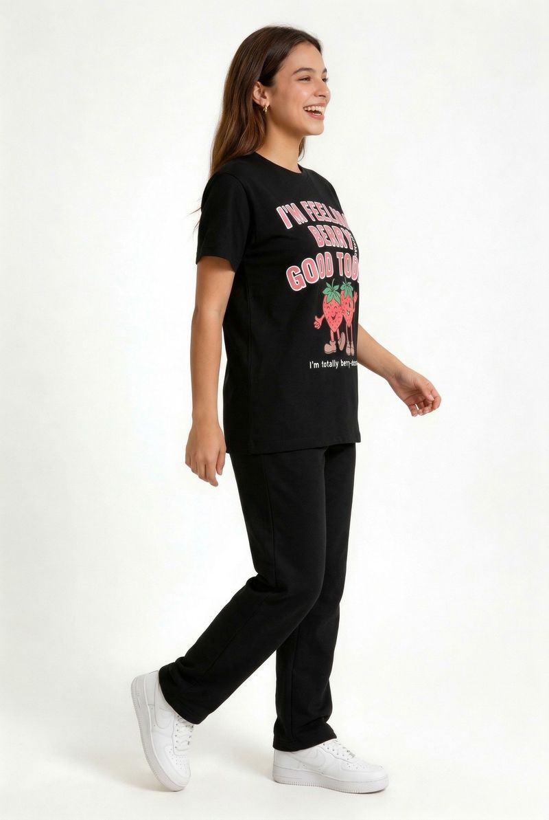 Sinta-se "Berry Good Today" com a blusa feminina Caedu. Em 100% algodão e meia malha, ela oferece conforto e estilo. A estampa divertida de morangos e a frase inspiradora trazem alegria. Uma roupa feminina perfeita para sua moda diária.