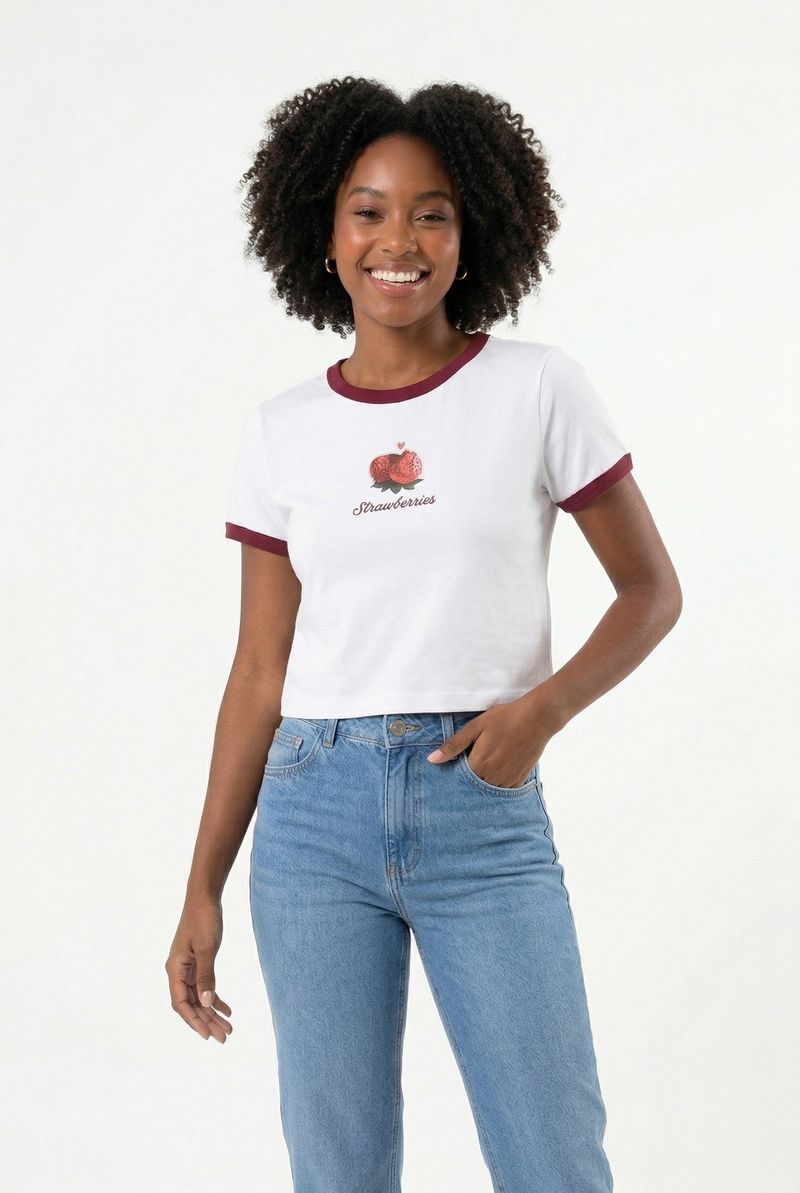 Conforto e estilo na Camiseta Feminina Caedu. Em cotton (96% algodão, 4% elastano), oferece toque suave. Design ringer com detalhes bordô e estampa de morangos vibrante garantem um visual moderno e versátil. Ideal para a moda Caedu.