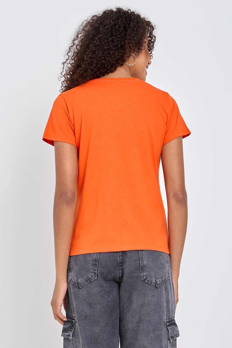 Blusa Caedu Lic Frajola Laranja com shorts jeans para um visual despojado, ou com uma calça preta de sarja para um toque mais arrumado. Nos pés, tênis brancos ou sandálias rasteirinhas complementam o look casual. Adicione acessórios como óculos de sol e uma bolsa transversal para finalizar.