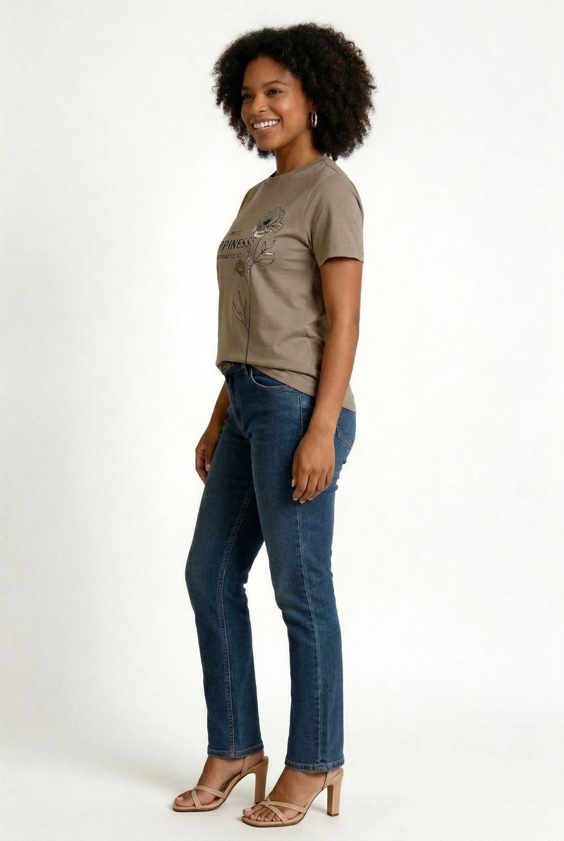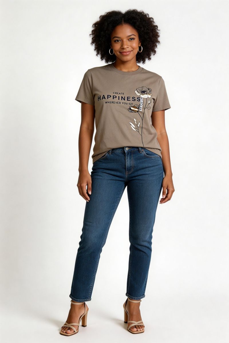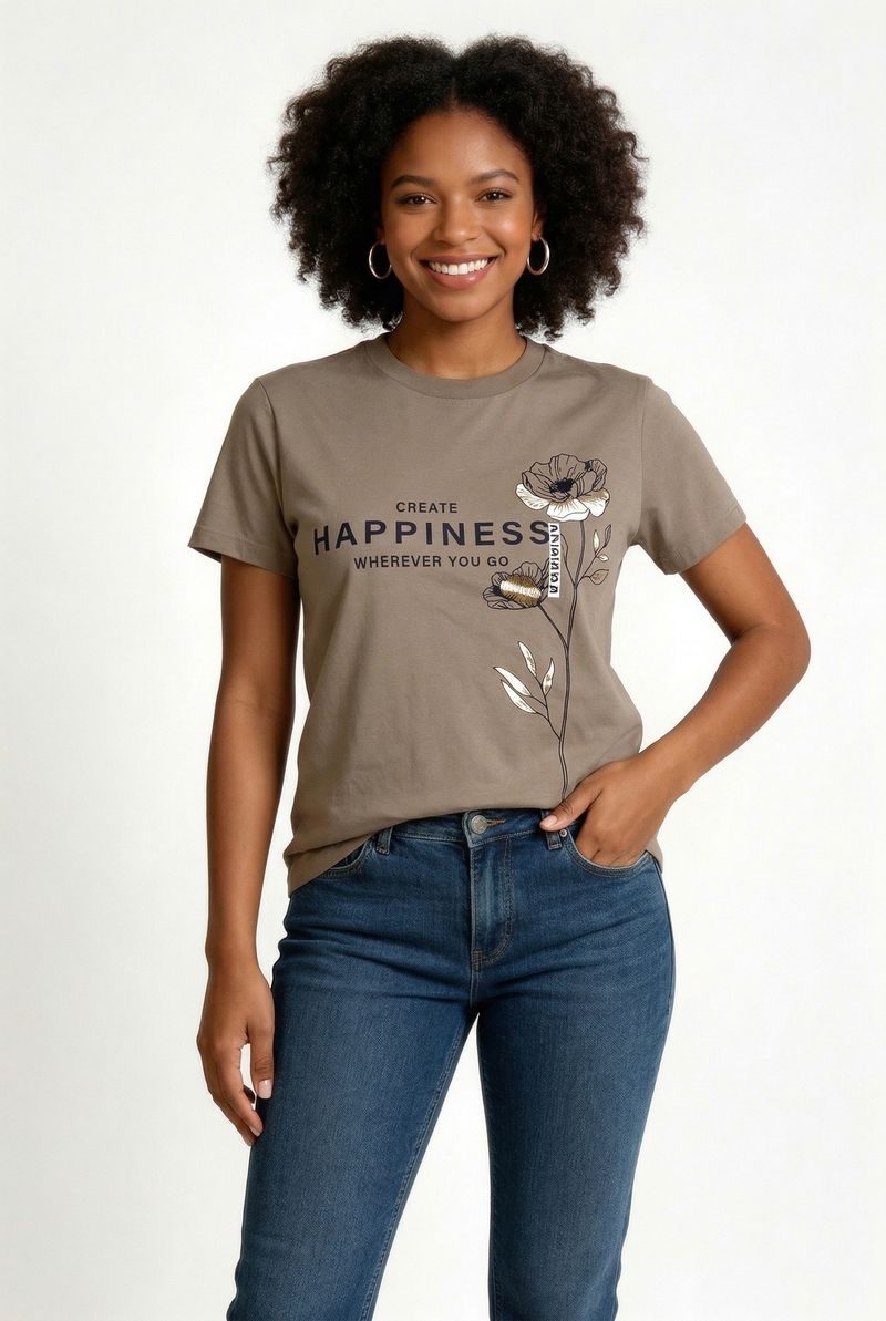 A Camiseta Feminina Bege Estampada 'Create Happiness' da Caedu oferece conforto e estilo. Em VISCOLYCRA, com caimento suave. A estampa motivacional e a cor bege, tom terroso em alta na moda, eleva seu look com um visual moderno e inspirador.