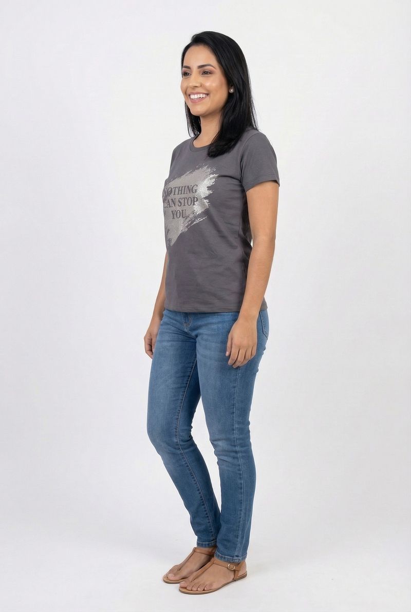 Detalhes: Estampa frontal com frase "Nothing Can Stop You" em prata