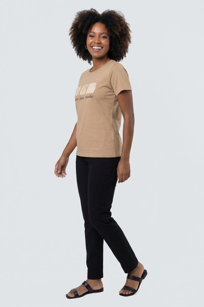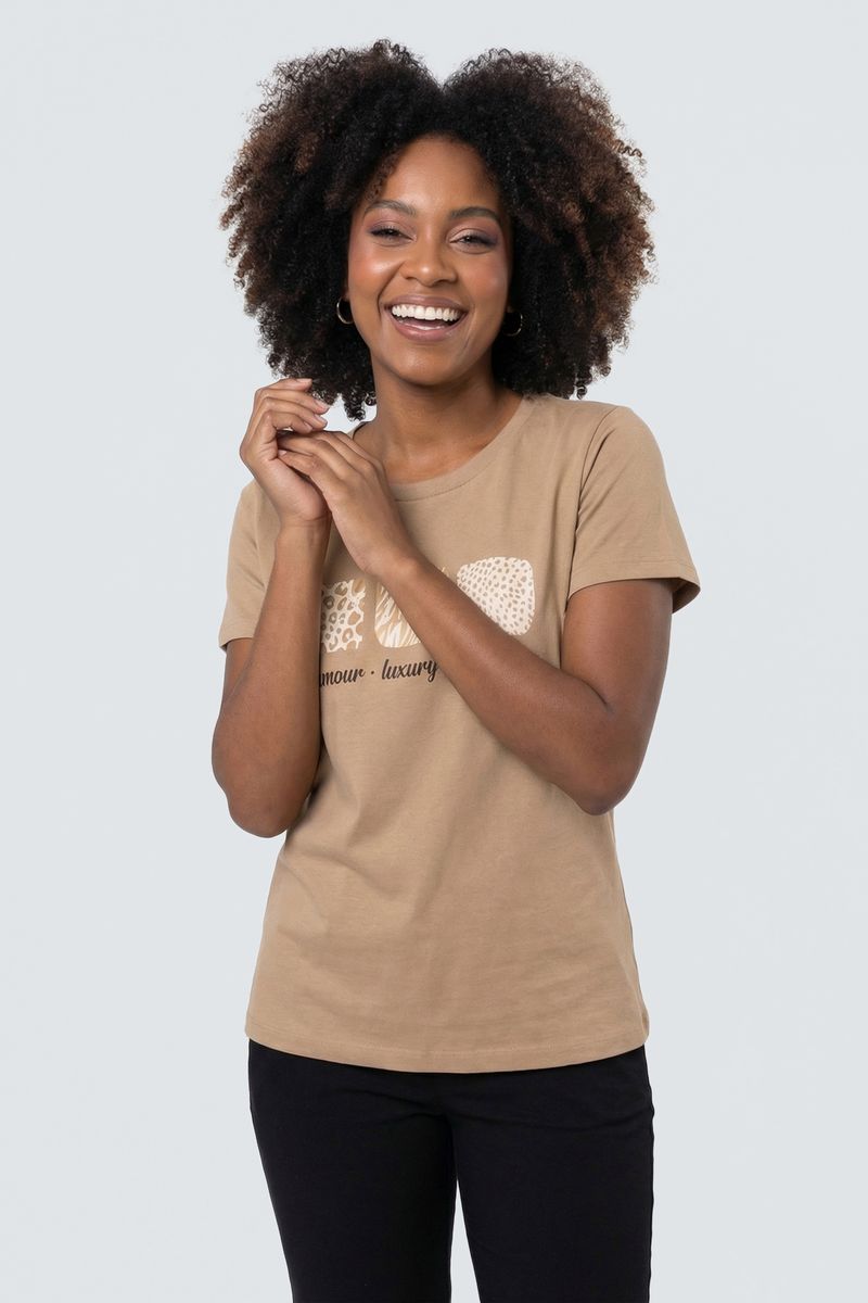 A Blusa Feminina Caedu, em tom bege terroso, eleva sua moda. Em meia malha, oferece conforto e luxo. Estampa 'Glamour Luxury Splendor' com detalhes animal print garante um visual moderno.
