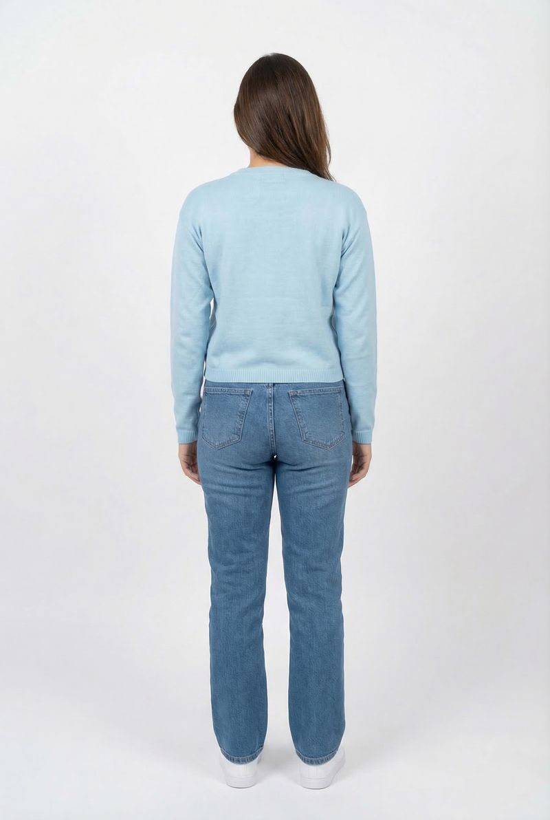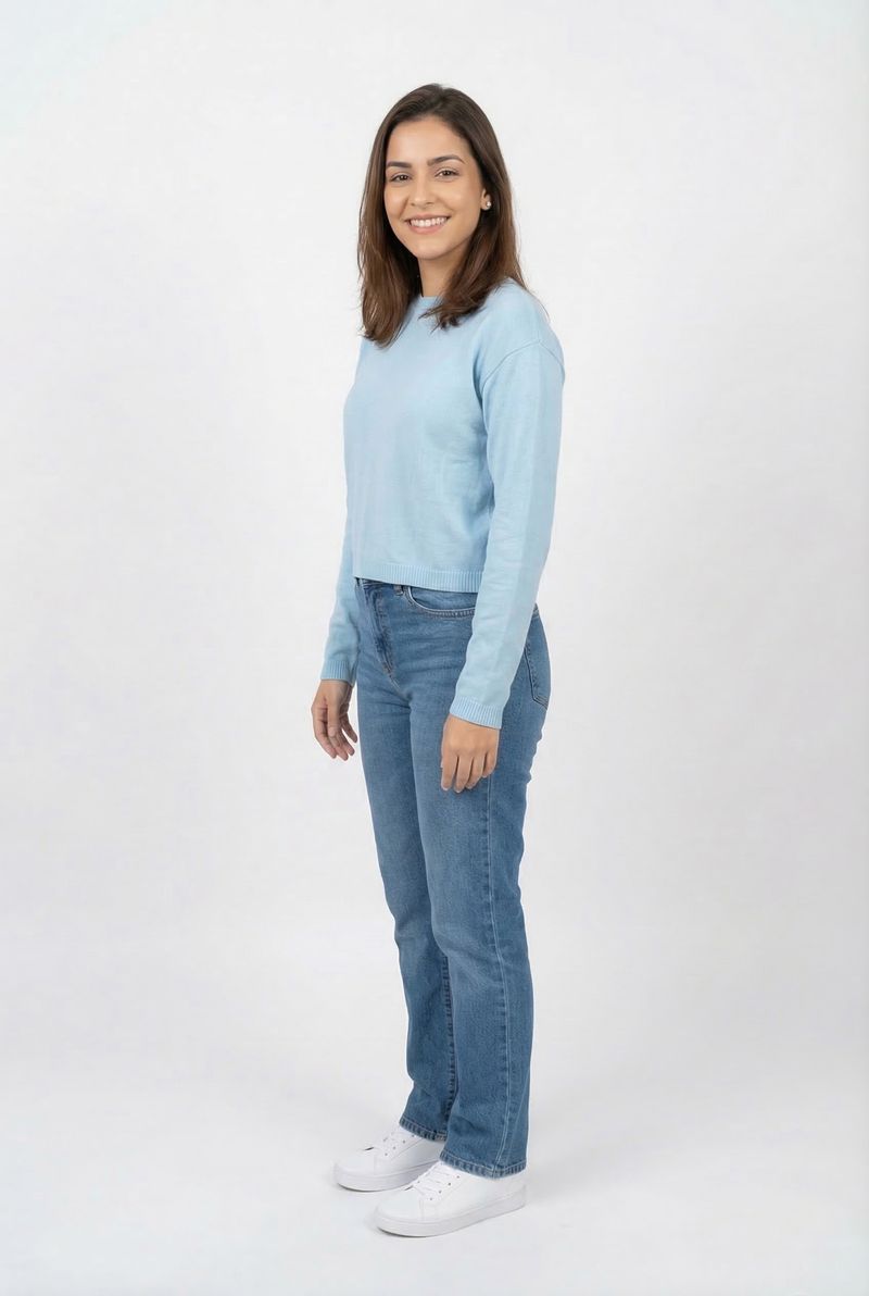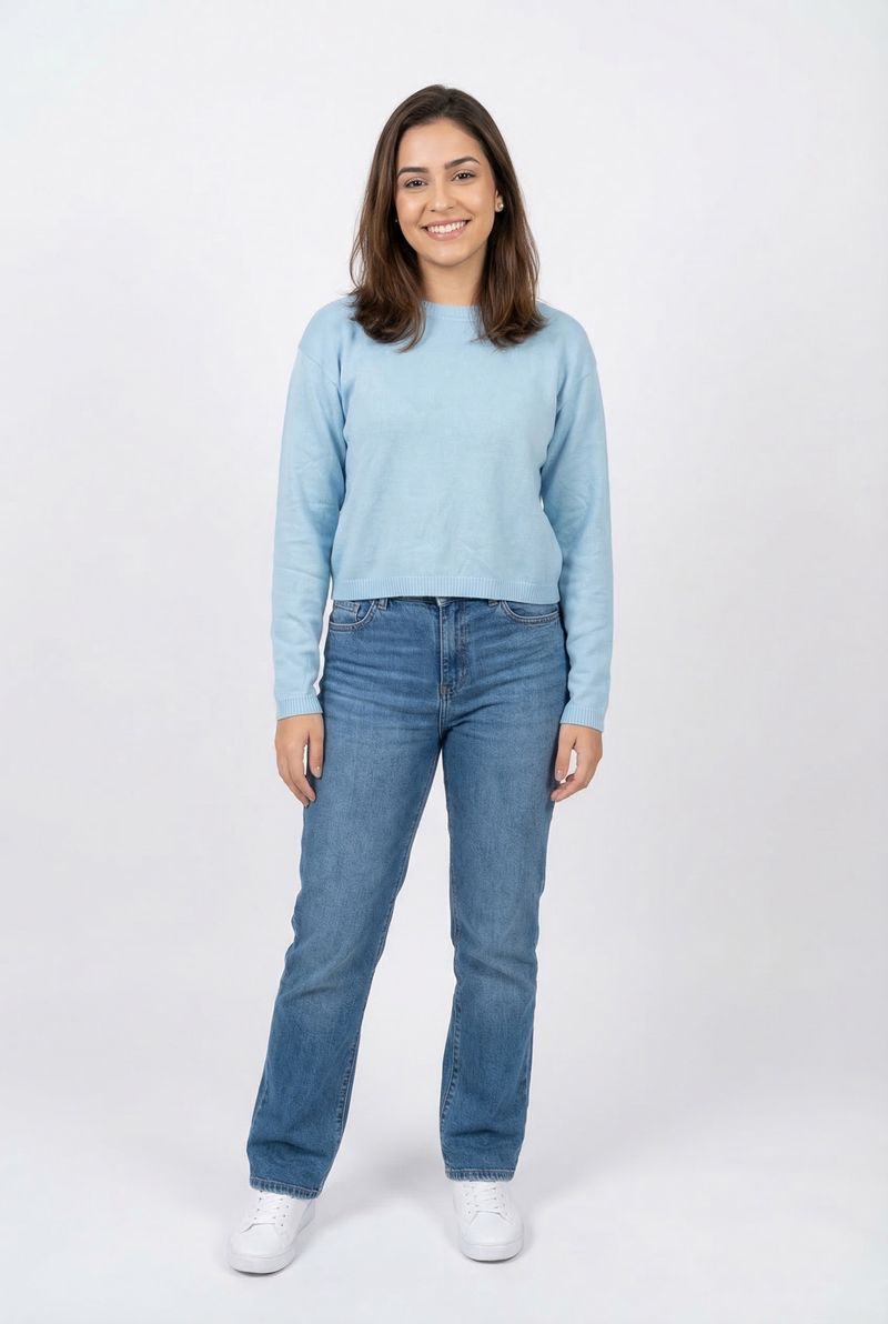 Combine o Suéter Feminino de Tricot Leve Azul Claro com calça jeans de lavagem média para um visual despojado, ou saia midi para um toque sofisticado. Complete com tênis brancos para conforto ou botas para um estilo elegante. Adicione acessórios discretos para realçar a beleza da peça.