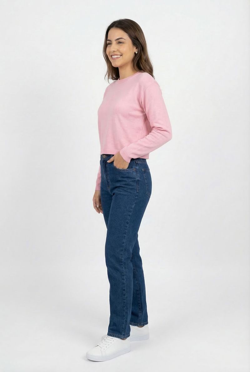 Combine o Suéter Feminino Tricot Cropped Rosa Claro Manga Longa com uma calça jeans de cintura alta para um look casual e moderno. Para um toque sofisticado, use com uma saia midi. Nos pés, tênis brancos para um visual despojado. Adicione acessórios discretos para finalizar seu estilo.