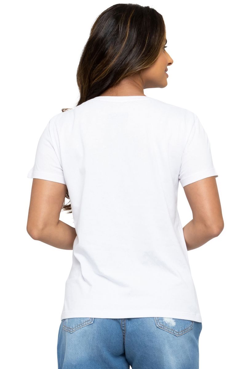 Blusa feminina casual. A peça possui estampa, decote redondo e manga curta.