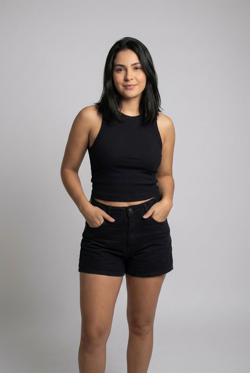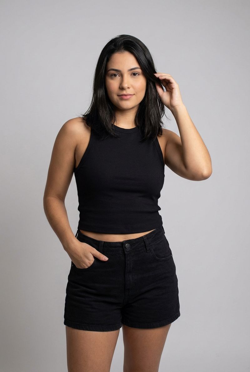 Combine sua regata preta canelada com shorts de cintura alta para um visual despojado, ou com uma saia midi e tênis para um toque urbano. Para um estilo mais sofisticado, use-a sob um blazer ou jaqueta jeans. Adicione acessórios como colares e pulseiras para personalizar seu look com a moda Caedu.