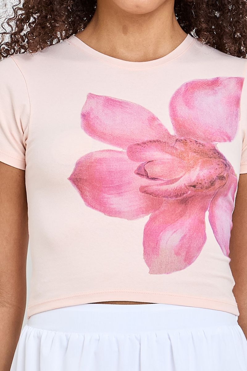 Combine com shorts jeans de cintura alta para um visual despojado, ou com uma saia branca fluida para um toque romântico. Complete com tênis brancos para conforto ou sandálias para um estilo mais sofisticado. Adicione acessórios delicados para realçar a estampa.