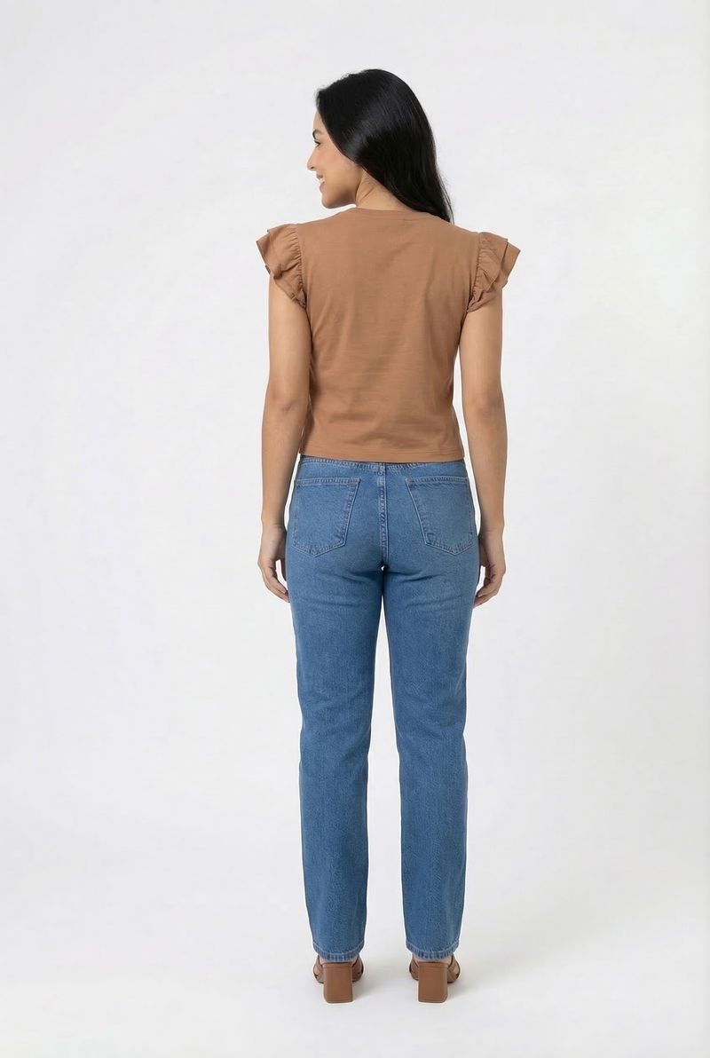 Detalhes: Babados nos ombros, manga curta, gola redonda