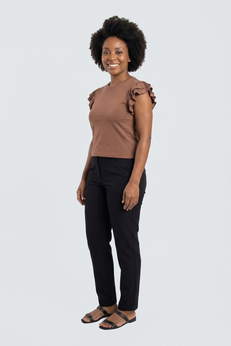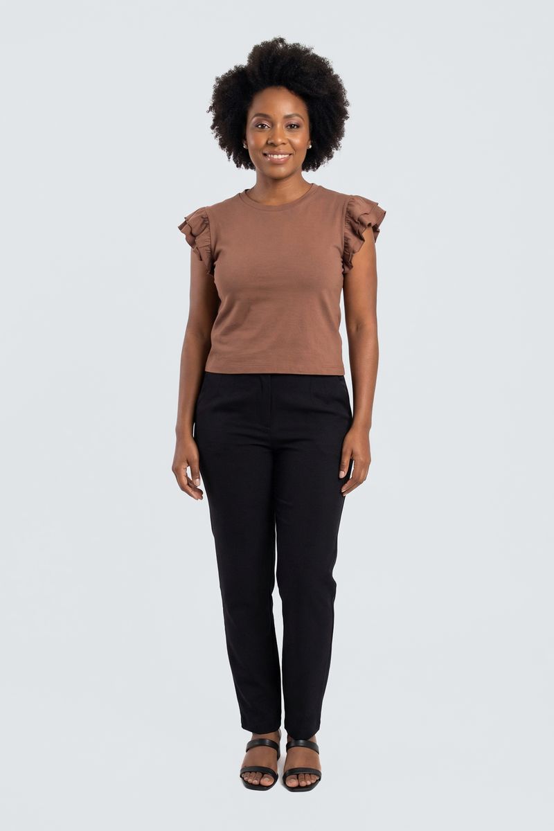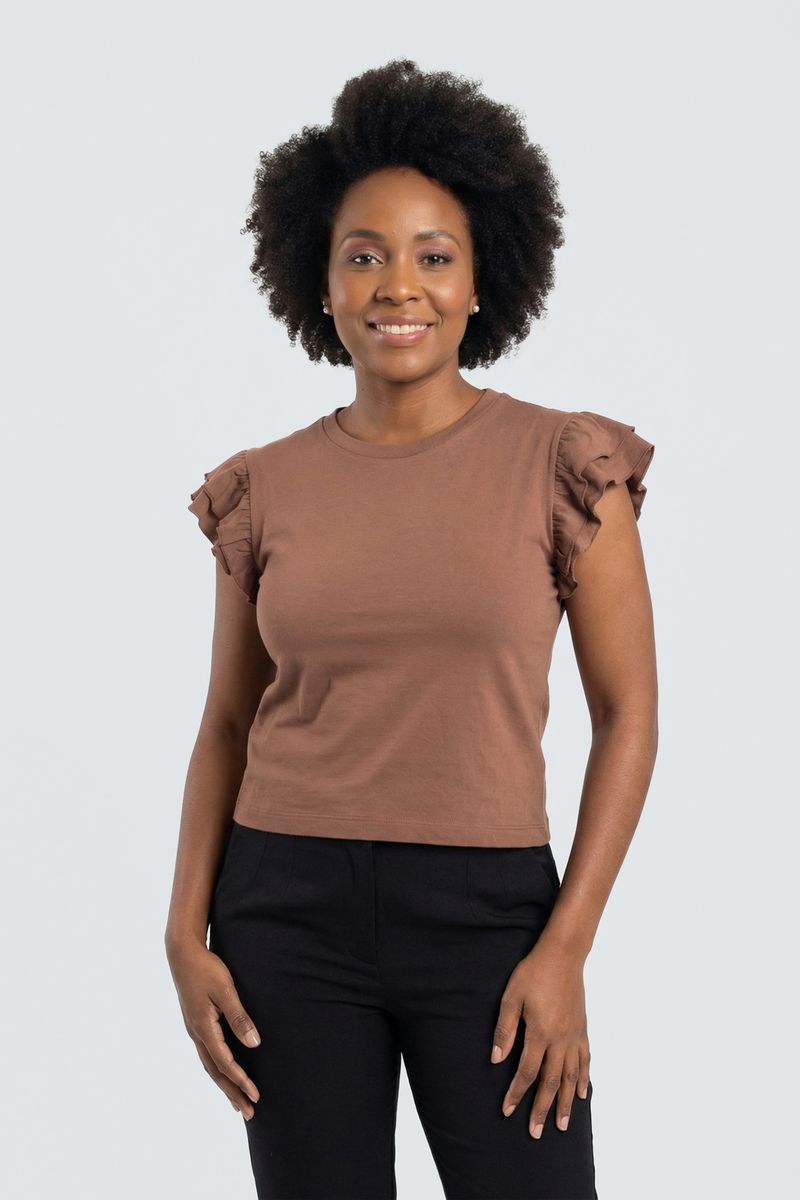 A Blusa Feminina Manga Curta com Babados Românticos Marrom Escuro Caedu eleva sua moda. Em tom terroso, oferece conforto e estilo romântico com mangas de babados. Cotton e elastano garantem caimento perfeito e versatilidade para looks femininos e modernos.