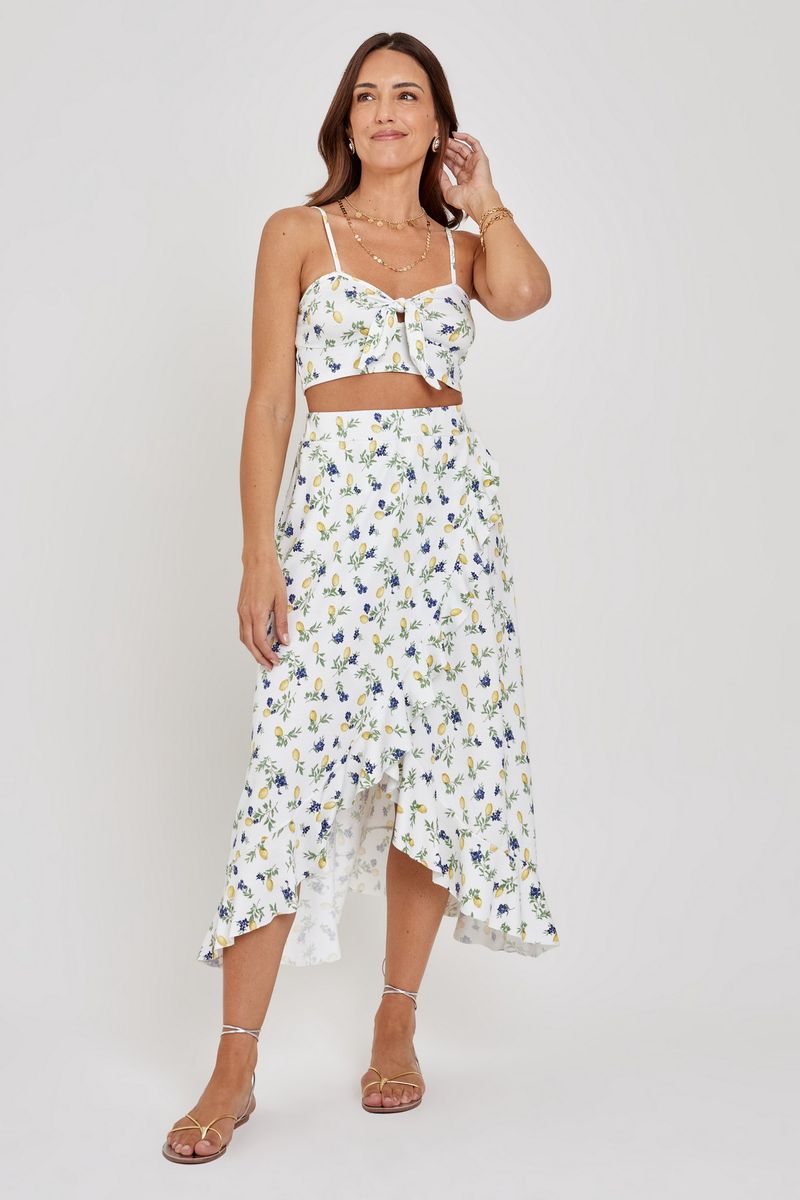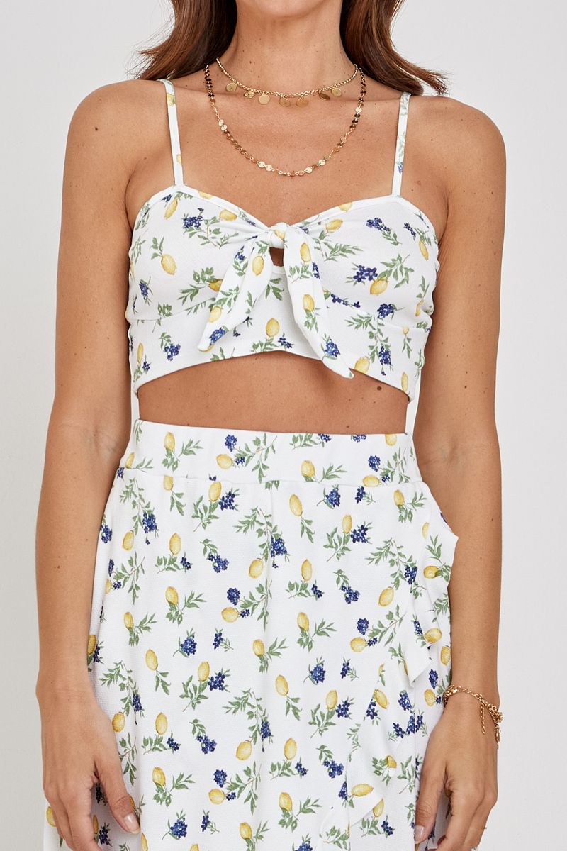 Celebre a moda com o Top Cropped Feminino Caedu, uma peça vibrante que exala frescor e estilo. Com sua exclusiva estampa limão siciliano e mirtilo e charmosa amarração frontal, este cropped em crepe oferece conforto e um toque de alegria para seus dias. Perfeito para quem busca um visual autêntico e cheio de personalidade.