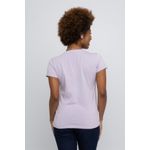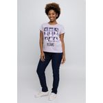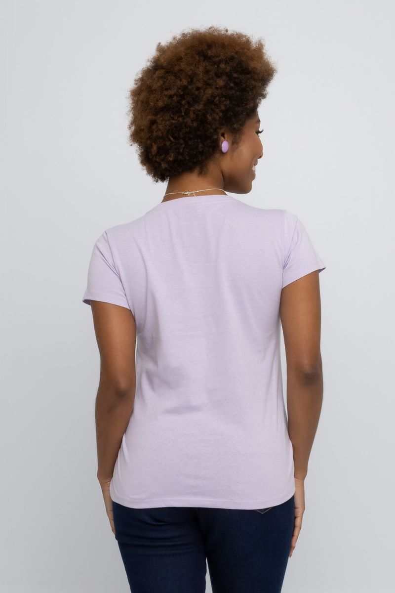 Blusa feminina casual. A peça possui decote redondo, estampa e manga curta.