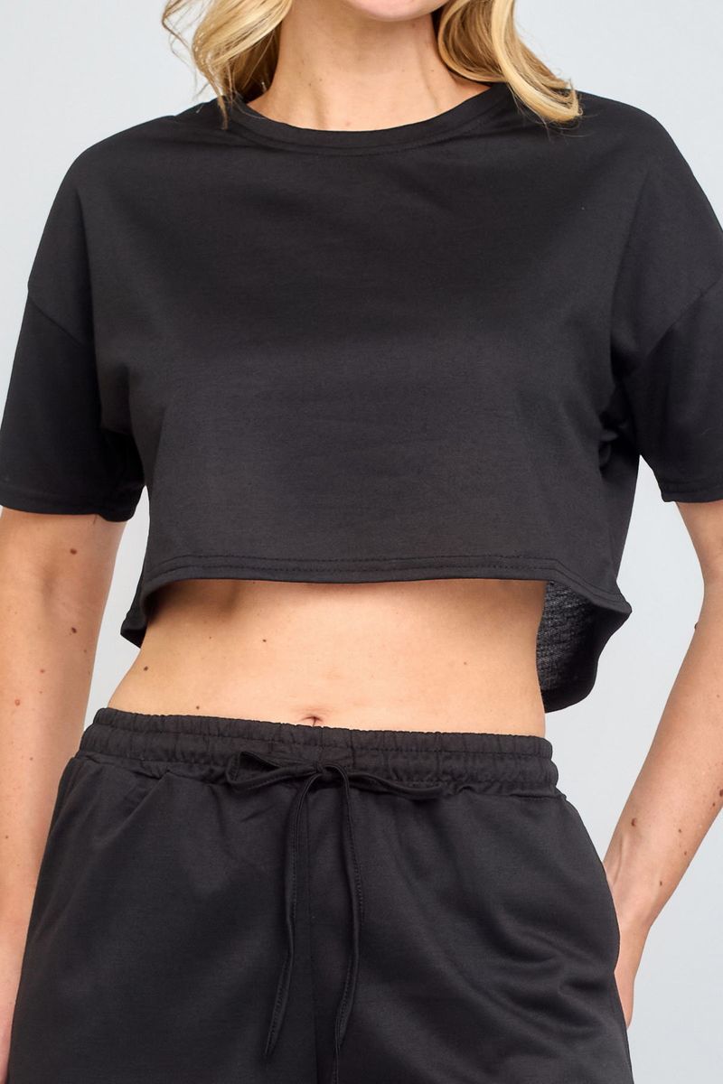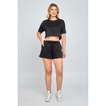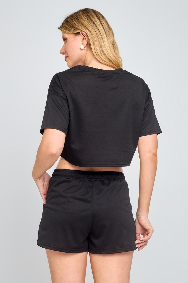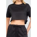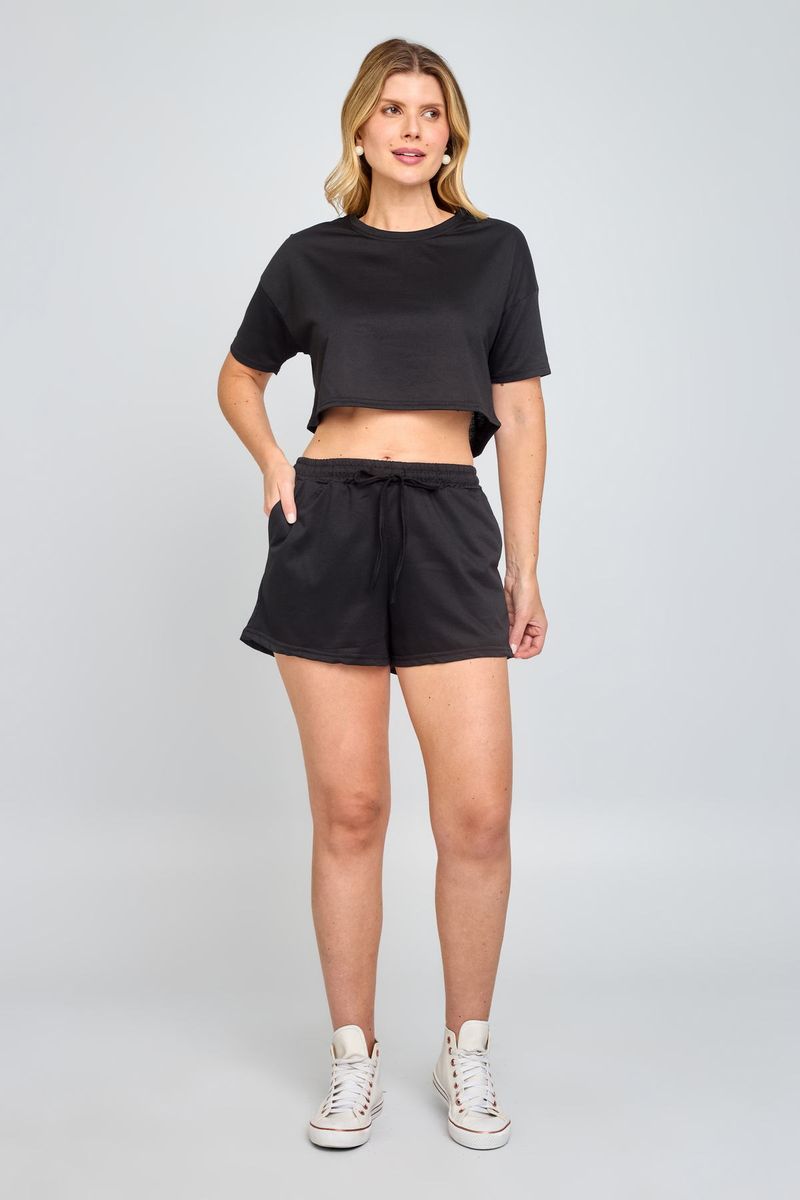 Blusa feminina de decote redondo e manga curta, confeccionada em moletinho preto. Confortável e prática para o dia a dia, perfeita para looks casuais.