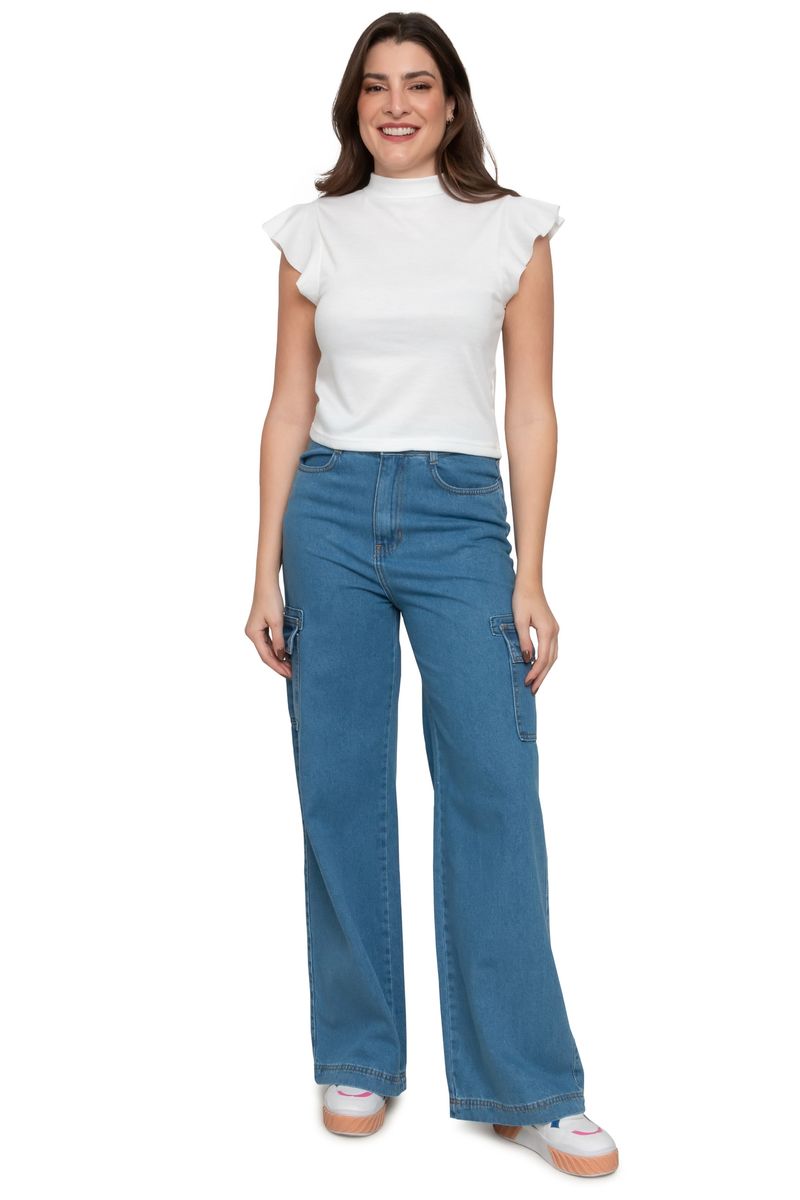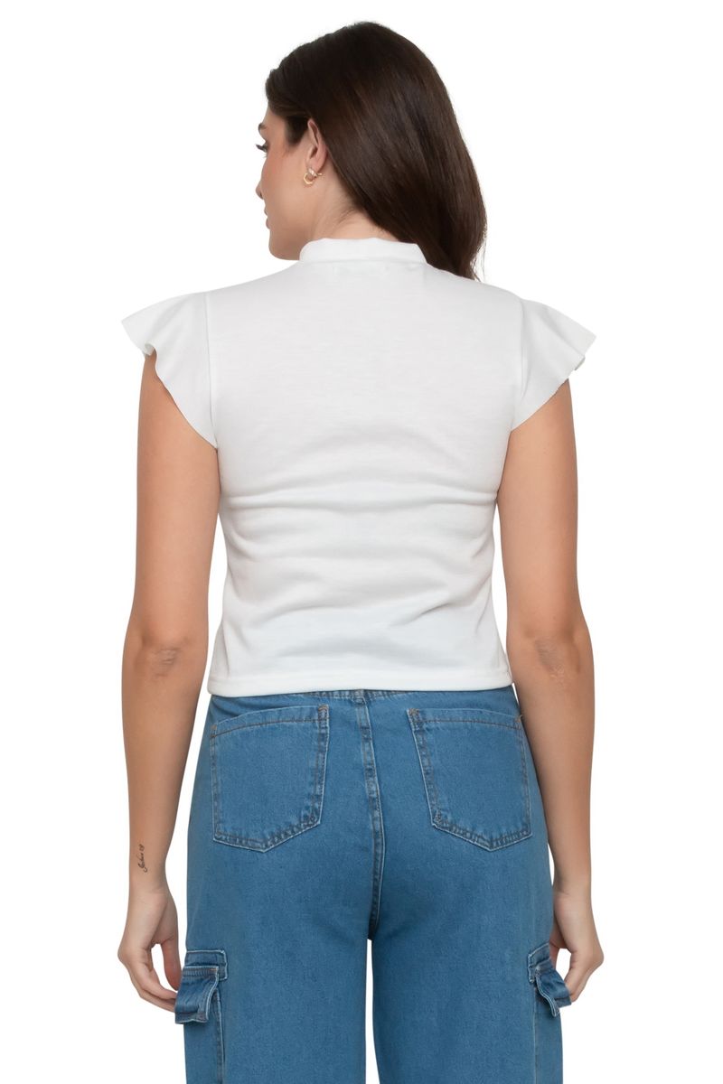 Blusa feminina confeccionada em ribana. Possui gola alta e mangas com babados.