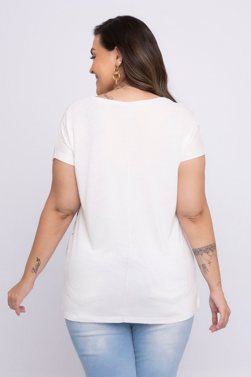 Blusa feminina casual. A peça possui estampa, decote redondo e manga curta. Modelo plus size.