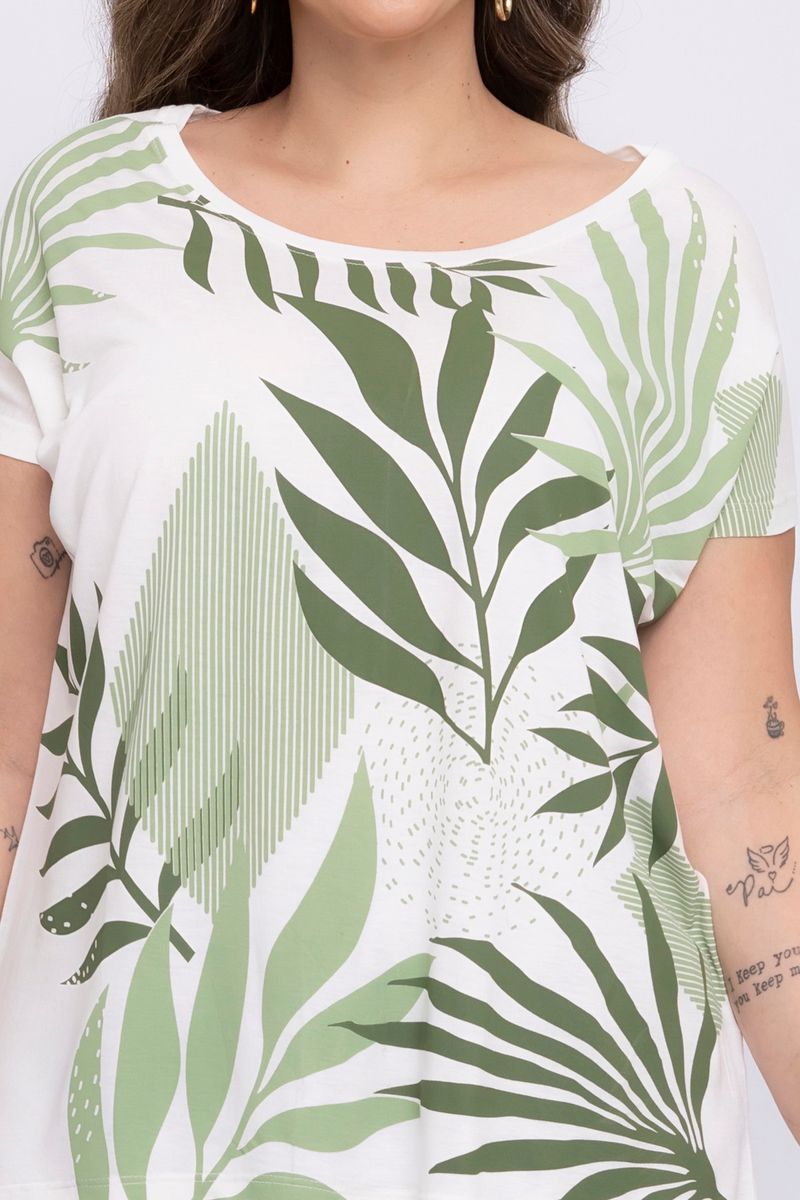 VestuárioFemininoNovidadesBlusas e CamisetasBlusa Feminina em Viscose Feita Pra Mim com Estampa Folhas Off White