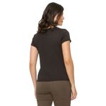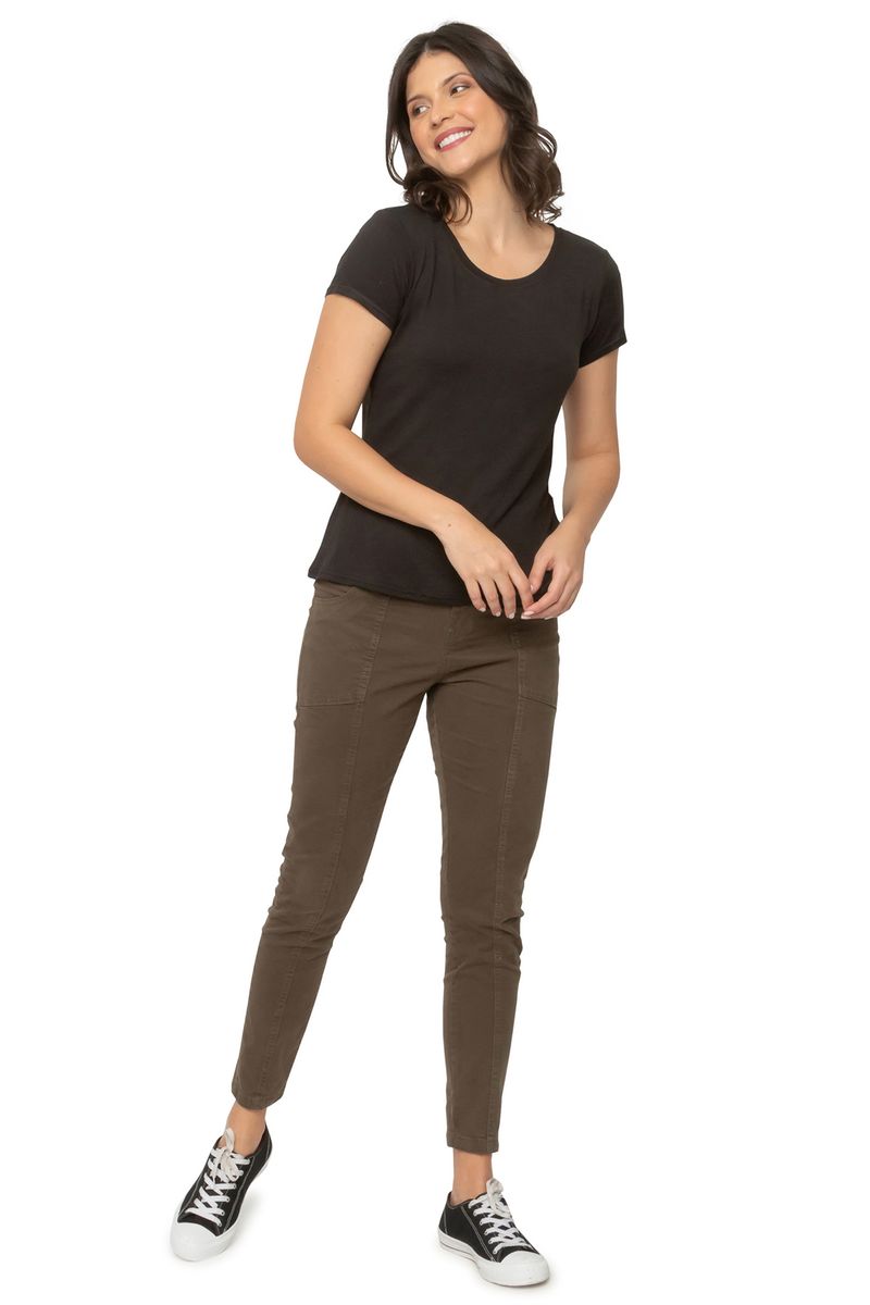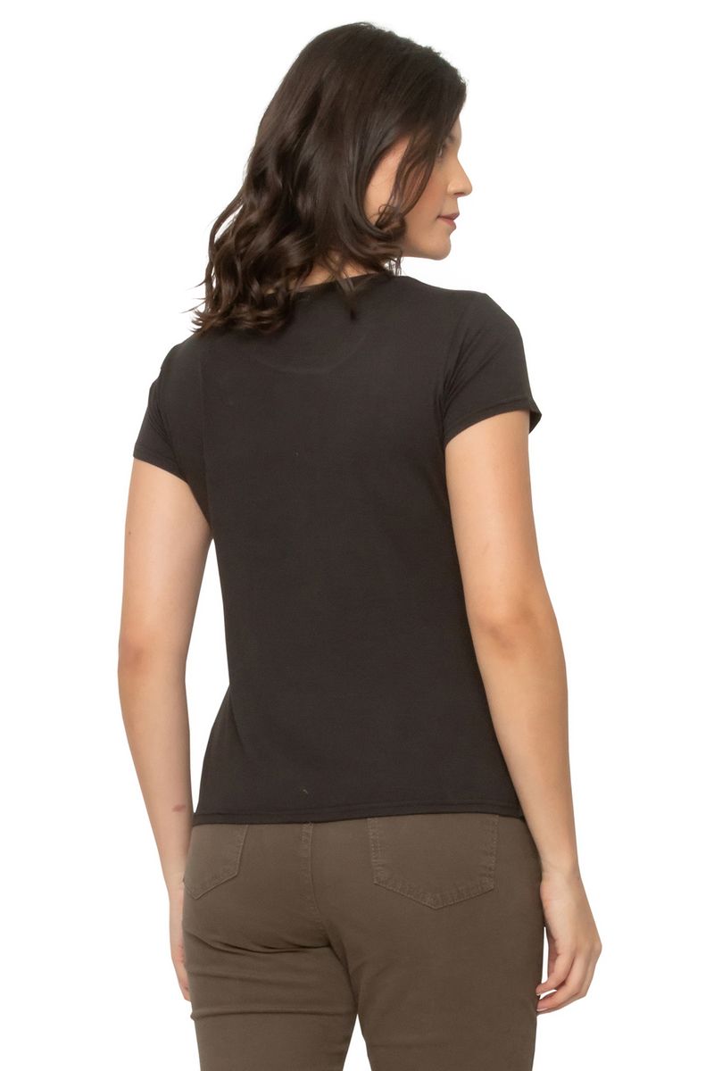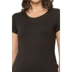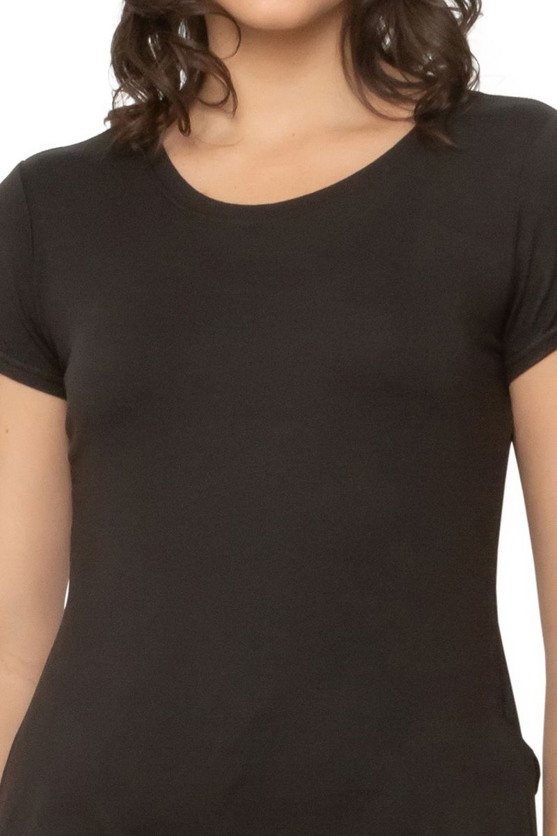 Blusa feminina lisa. A peça possui decote redondo e manga curta.