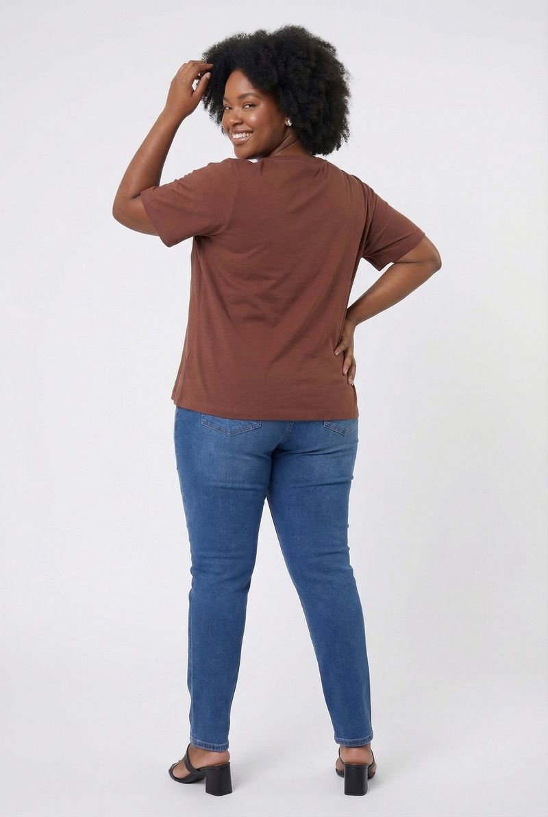 Para um look casual e moderno, combine esta camiseta com uma calça jeans de lavagem clara ou escura e tênis confortáveis. Para um toque mais sofisticado, adicione uma jaqueta de couro ou um blazer alongado e combine com calças de alfaiataria e sapatos de salto bloco. Experimente também usá-la com saias de diferentes comprimentos e sandálias rasteirinhas para um visual leve e feminino, ideal para os dias mais quentes. Finalize com acessórios como colares delicados e bolsas tiracolo para um toque extra de estilo.