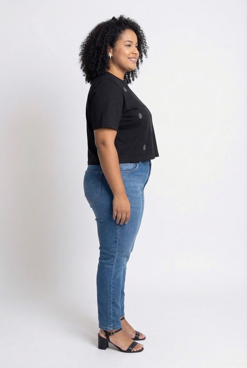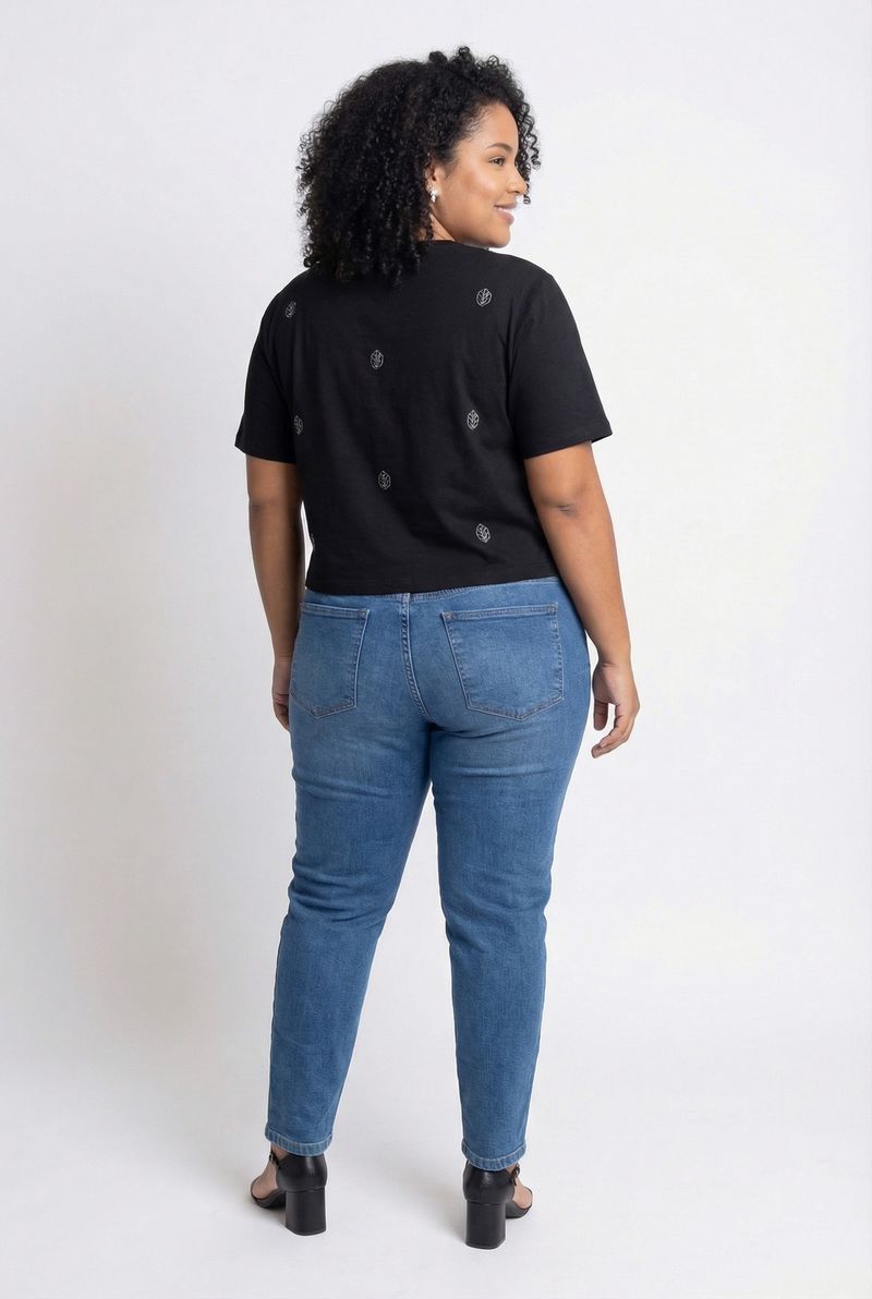 Combine a blusa com uma calça jeans de lavagem média para um visual clássico e despojado. Para um toque mais leve, aposte em shorts ou saias. Complete o look com sandálias de salto bloco ou tênis brancos para um estilo casual chic. Adicione acessórios discretos para realçar a estampa.