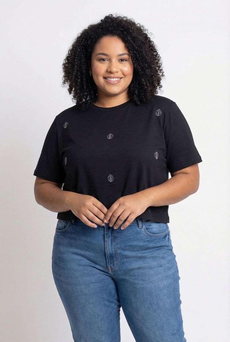 Descubra a Blusa Feminina Caedu, ideal para um visual moderno e confortável. Com estampa de folhas brancas sobre fundo preto e manga curta, esta peça versátil oferece estilo e personalidade para seu dia a dia. Sinta-se bem e na moda.