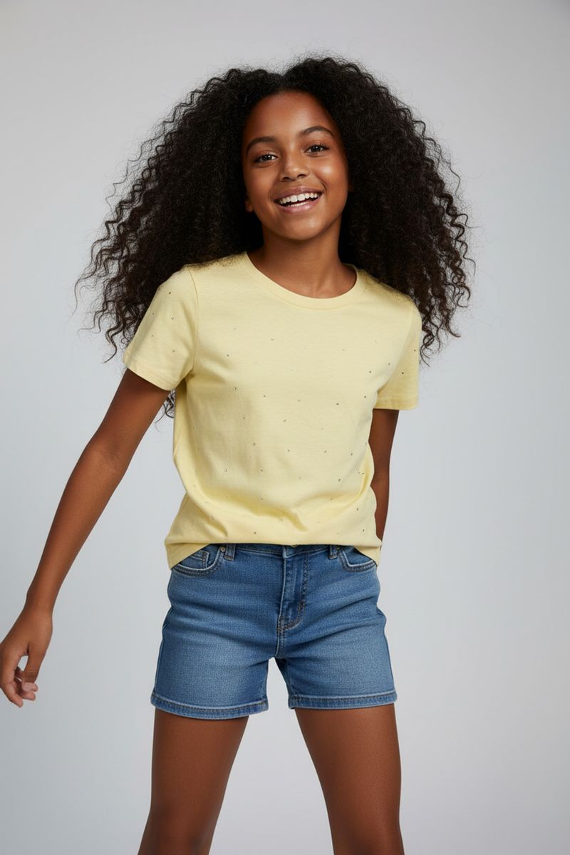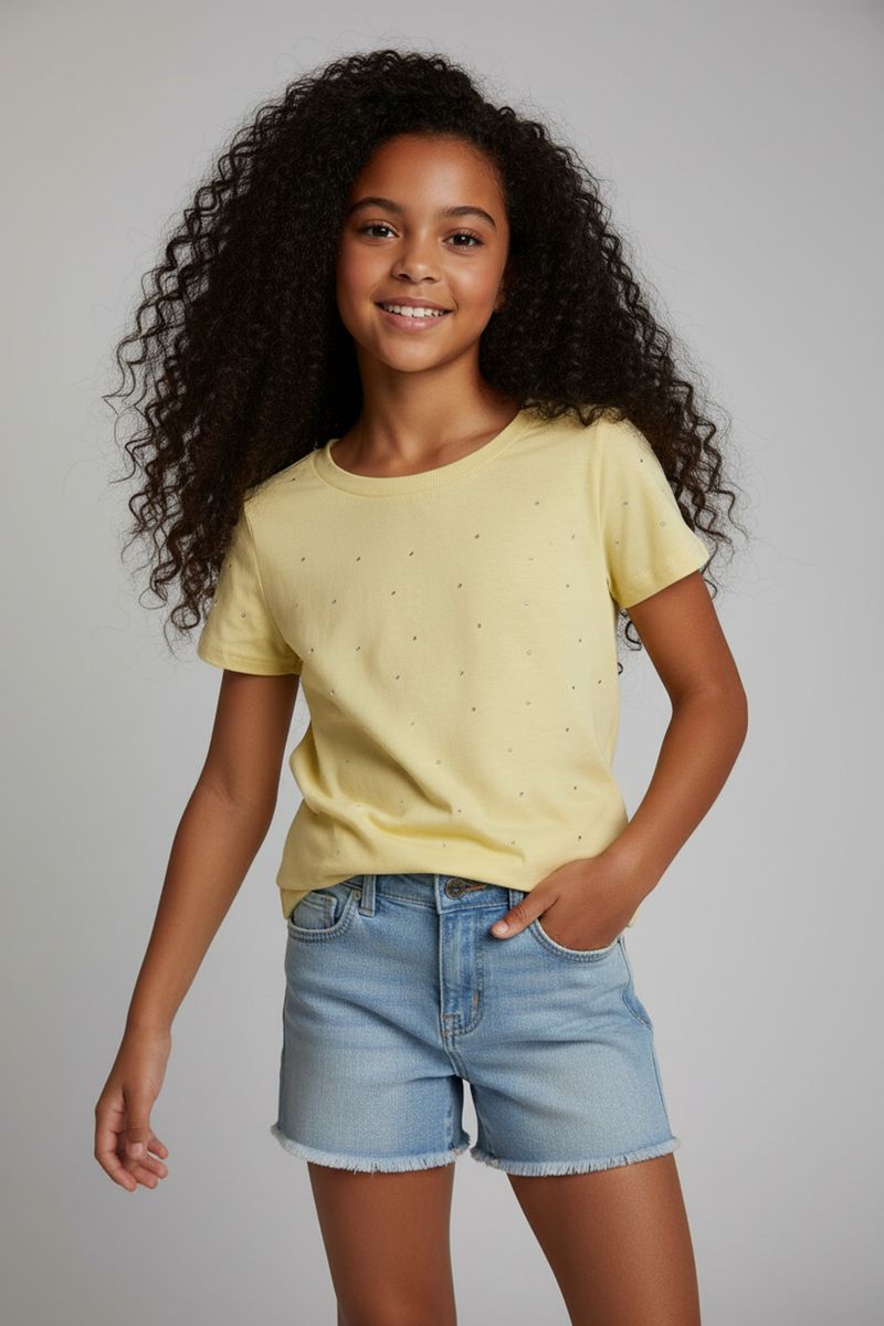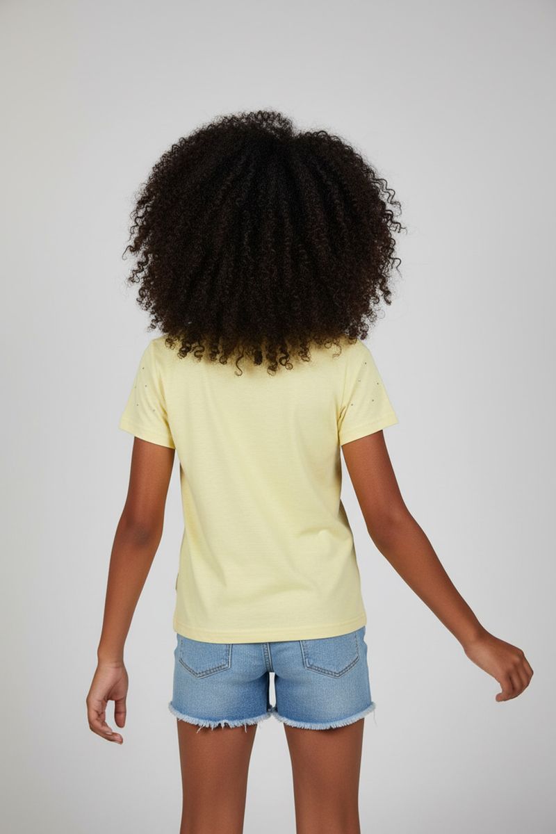 A Blusa Juvenil Caedu Amarelo Claro é a roupa perfeita para brilhar! Confeccionada em MEIA MALHA, oferece conforto e leveza. Seus apliques de strass na parte frontal adicionam um toque cintilante, ideal para a moda jovem. Encontre na Caedu loja virtual.