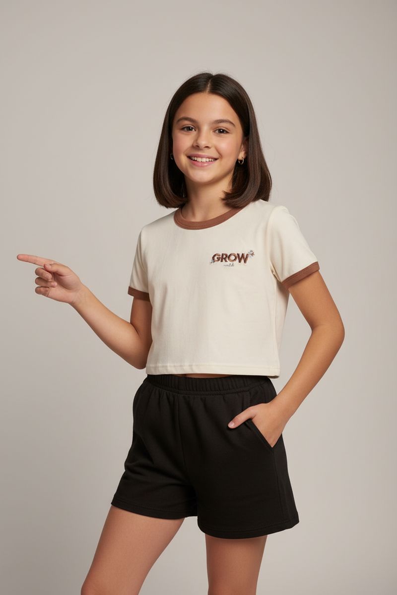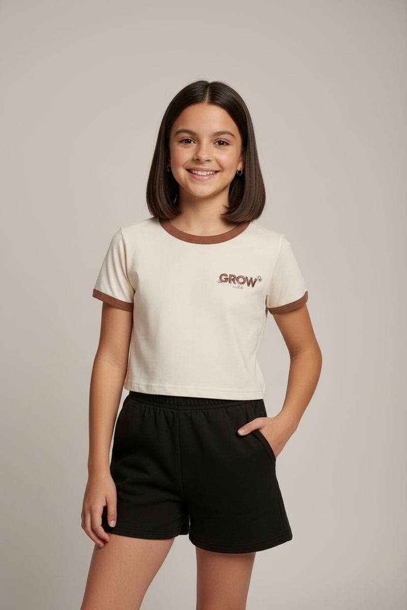 A Blusa Cropped Infantil Ringer Algodão 'GROW' Caedu oferece conforto e estilo. Em algodão off white, com gola e mangas ringer contrastantes e bordado 'GROW', é ideal para um visual moderno e inspirador. Perfeita para as pequenas.