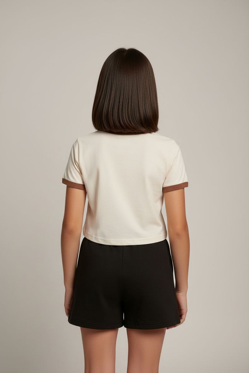 Combine sua blusa cropped com um shorts preto para um look descontraído. Adicione um tênis casual e acessórios como boné ou tiara. Fica ótima também com saias jeans ou calças de moletom, criando um visual versátil e confortável, perfeito para a moda infantil da Caedu.